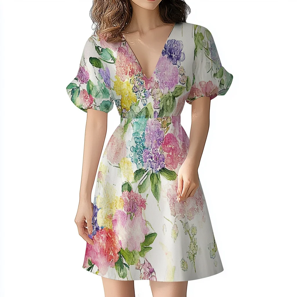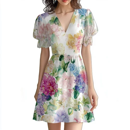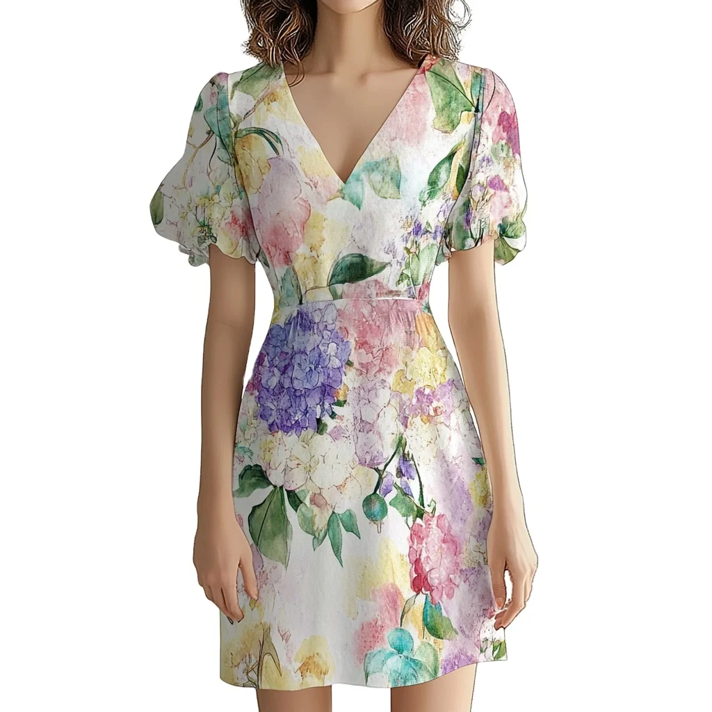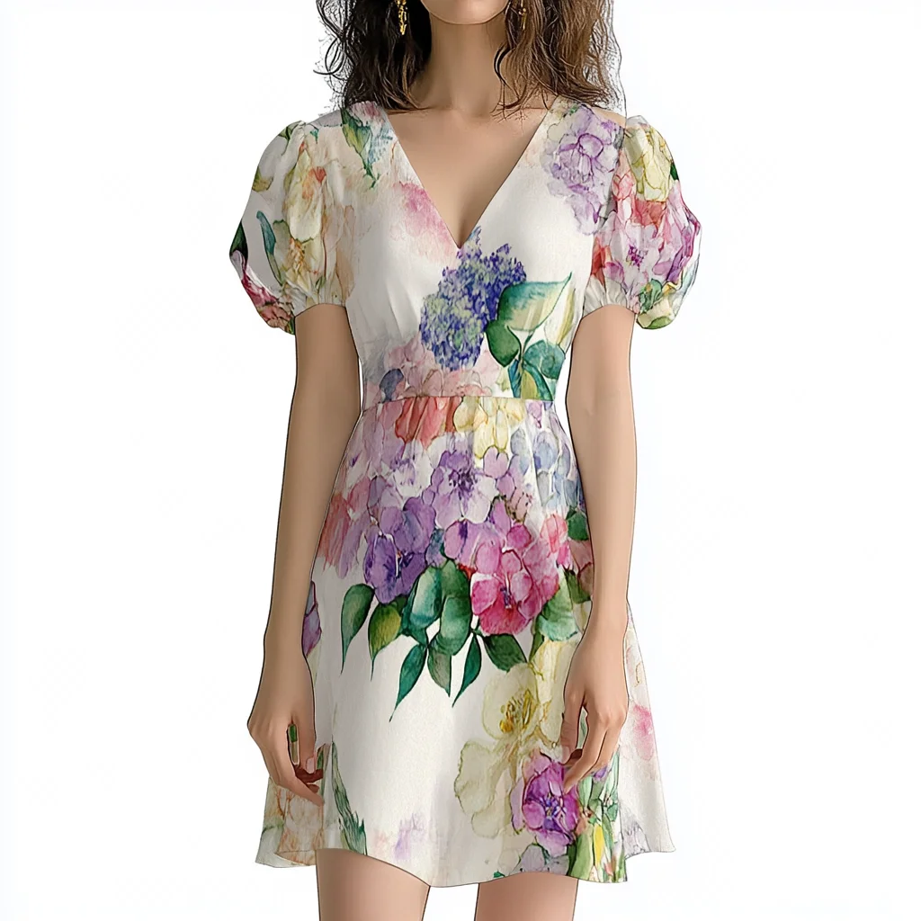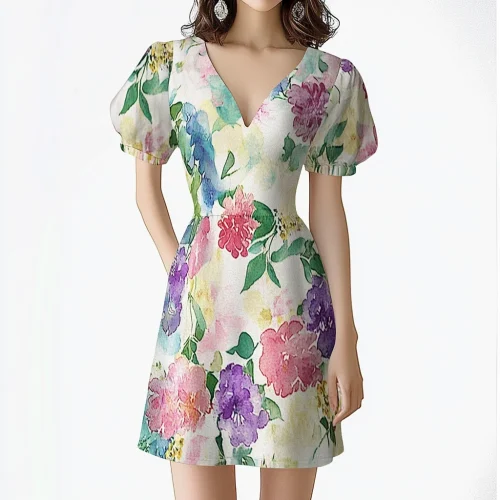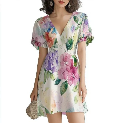 Product Name: Summer Women New Style V Neck Puff Short Sleeve Floral Print Elegant Vacation Dress Ladies Casual Mini Dresses