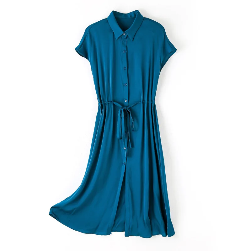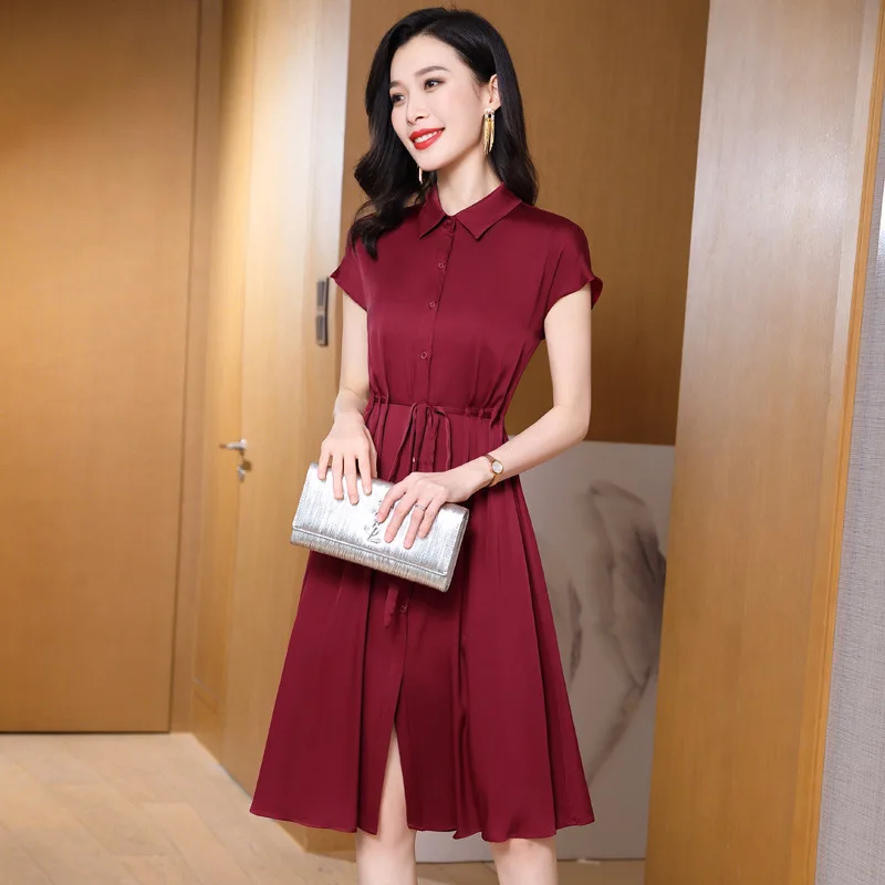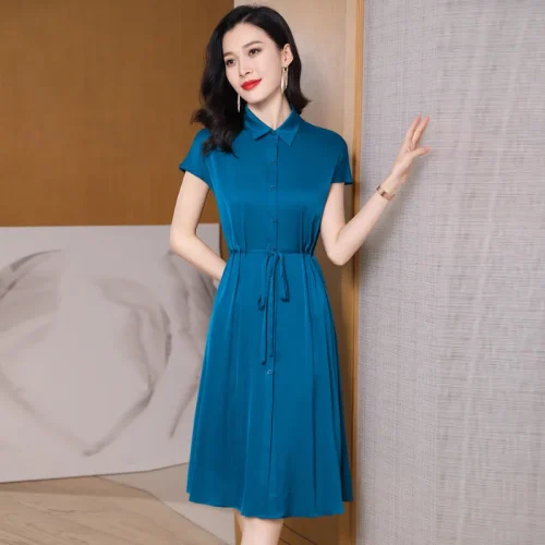Product Name: Summer’s New Elegant Korean-style Silk Mid-length Dress, Casual Solid-color Fashionable Women’s Luxurious Silk Dress