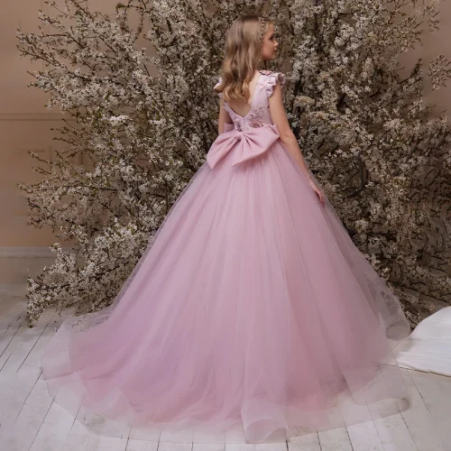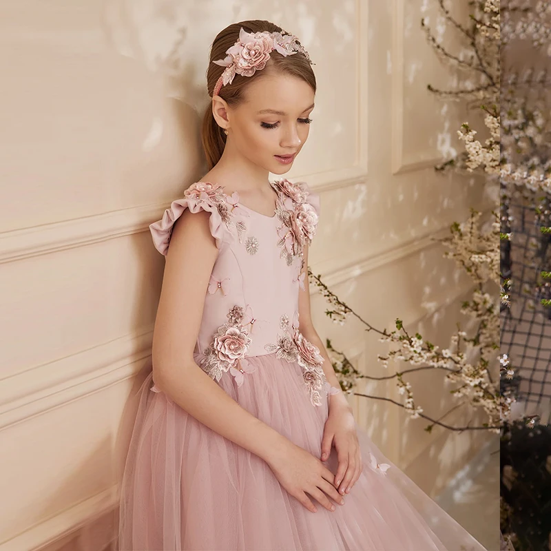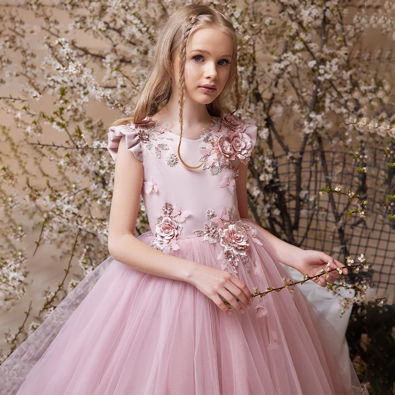 Product Name: Sweet Formal Style Luxury Long Tulle Ball Gown Dress Kids Girls Cap Sleeves Appliqued Petal Flower Girls O-Neck Summer Dress