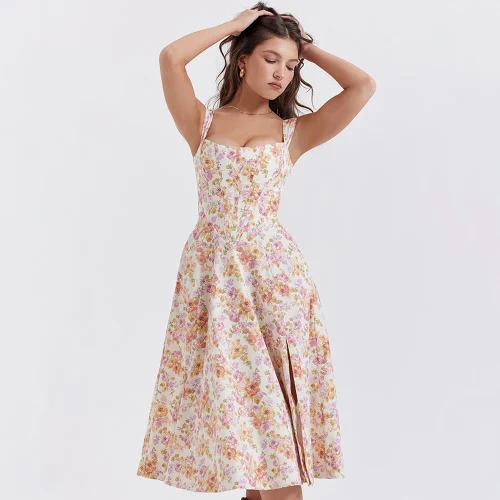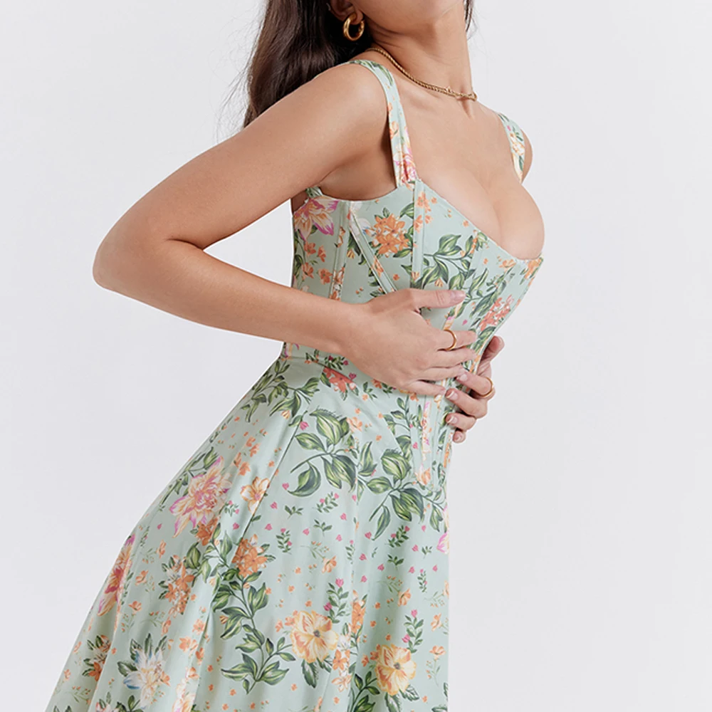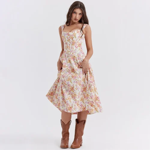 Sweet Summer Floral Print Casual Dresses Slim Waist Lace up Pockets Hidden Zippers Midi a Line Vacation Sundress