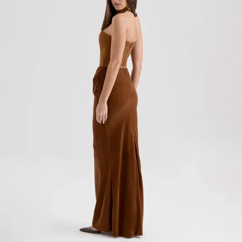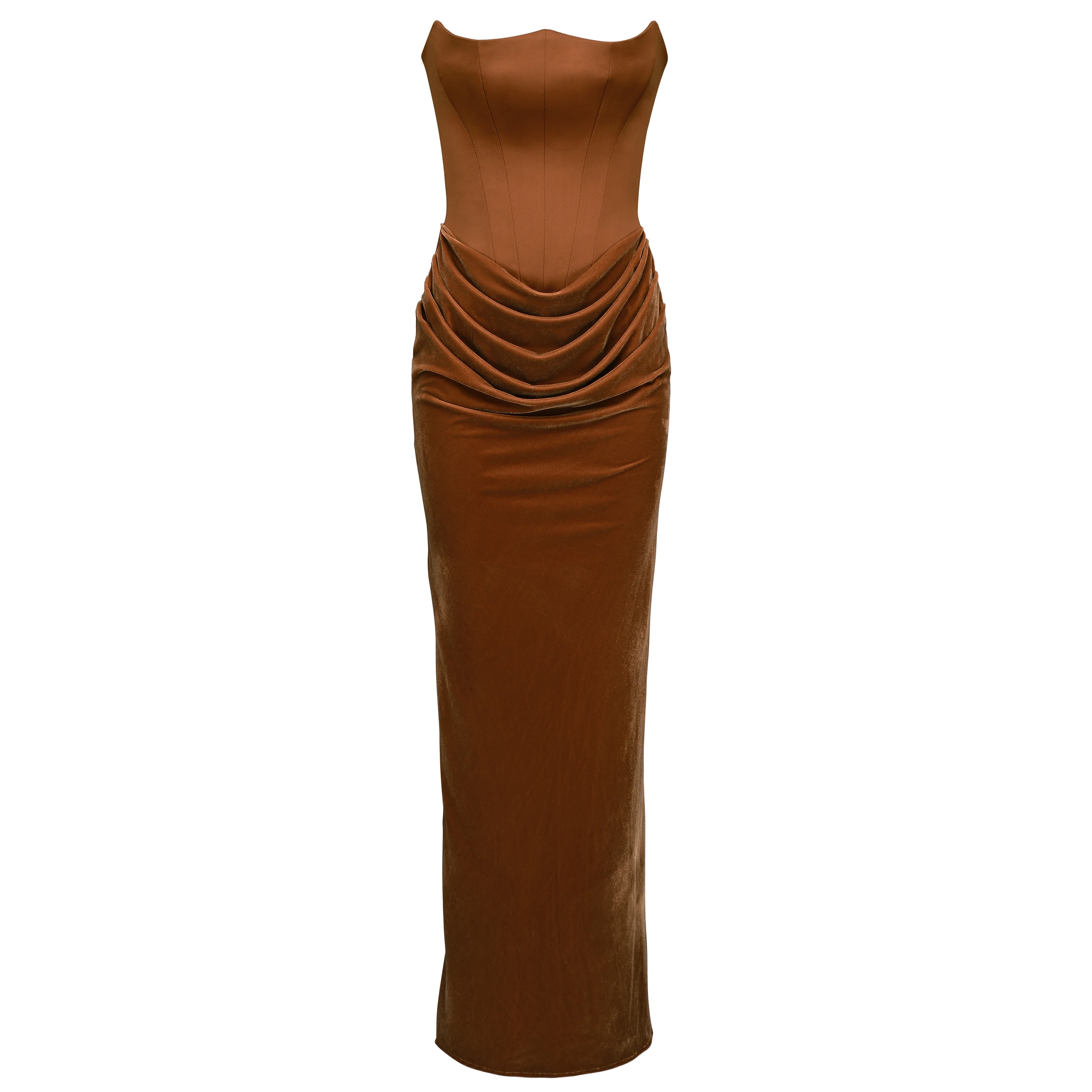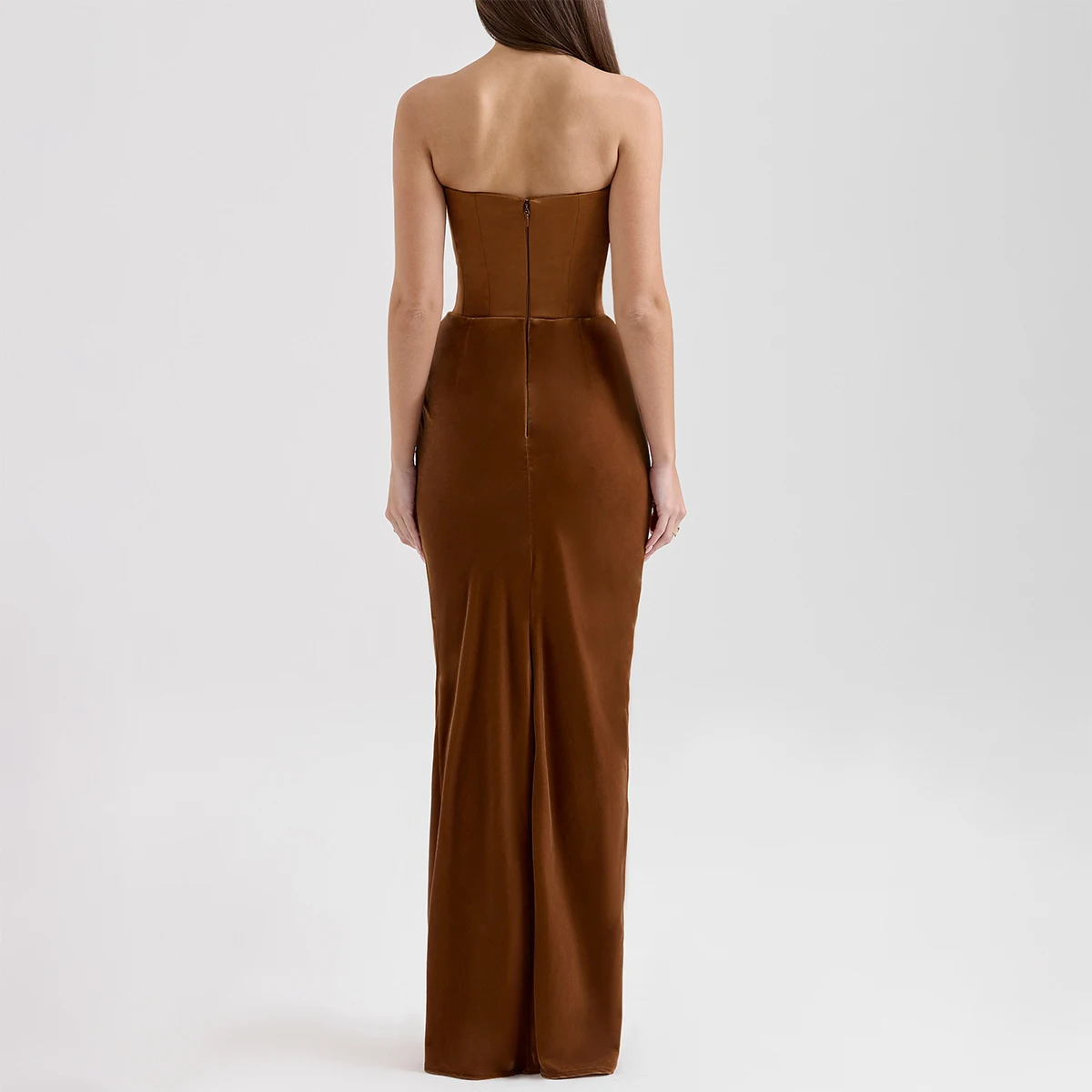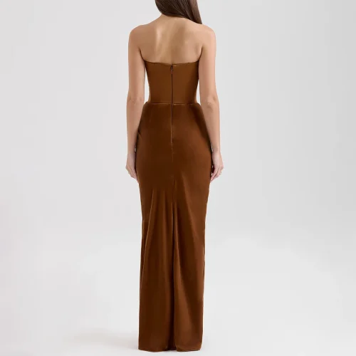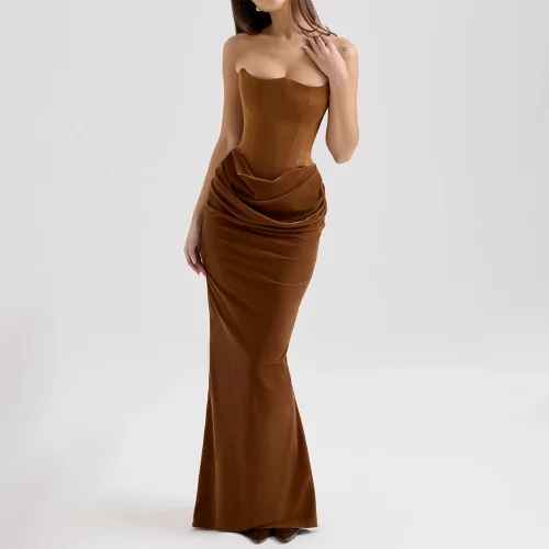 Toffee Velvet Strapless Corset Maxi Dress for Women Elegant Evening Gown Formal Party Dress