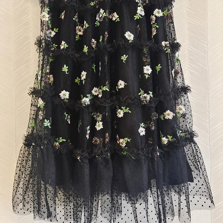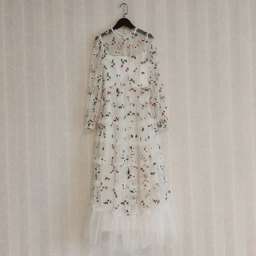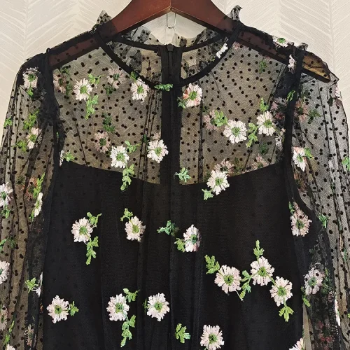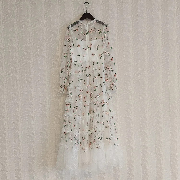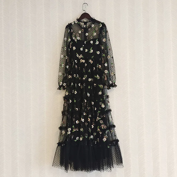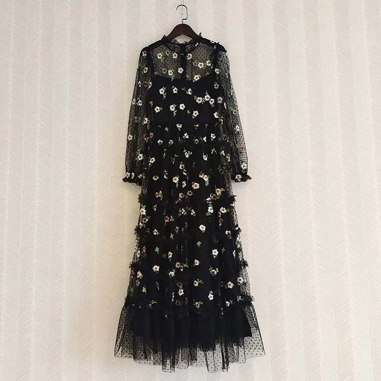 Product Name: Top Quality New Long Dress 2022 Spring Party Evening Women Sexy Tulle Mesh Embroidery Long Sleeve Black White Long Maxi Dress