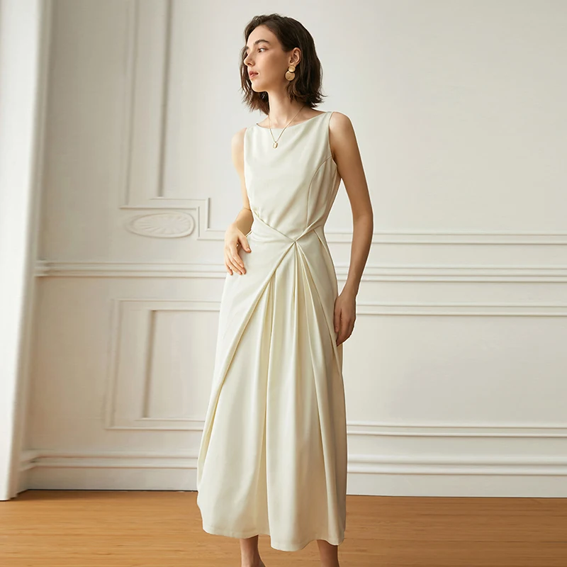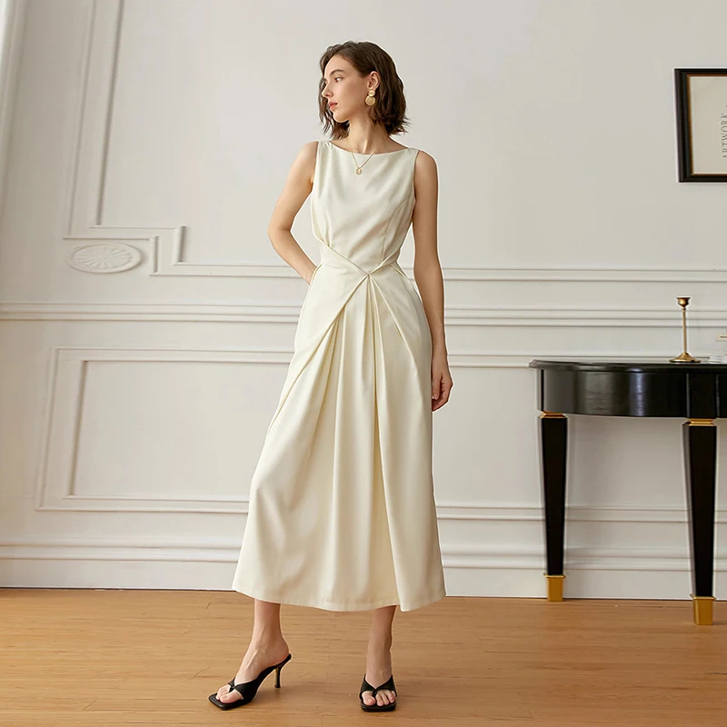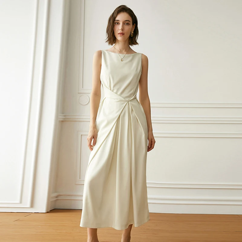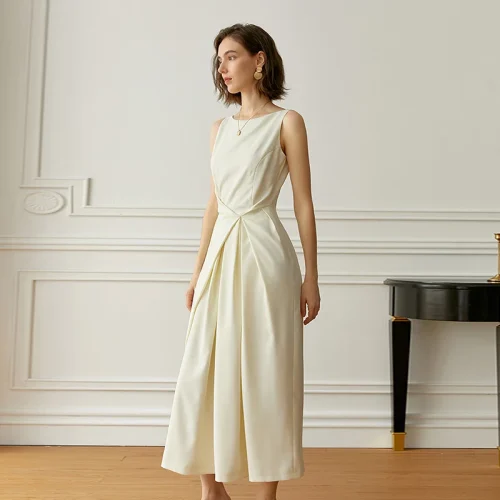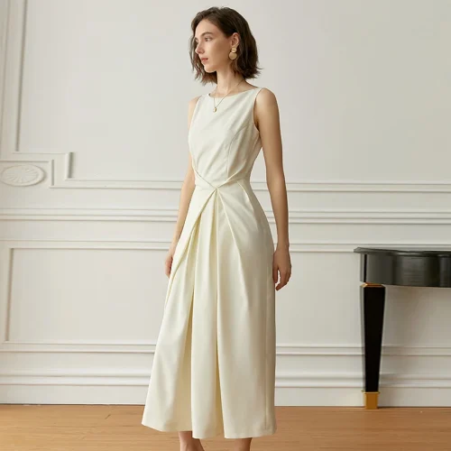 TWOTWINSTYLE Casual Round Neck Sleeveless High Waist Solid Color White Dress for Women