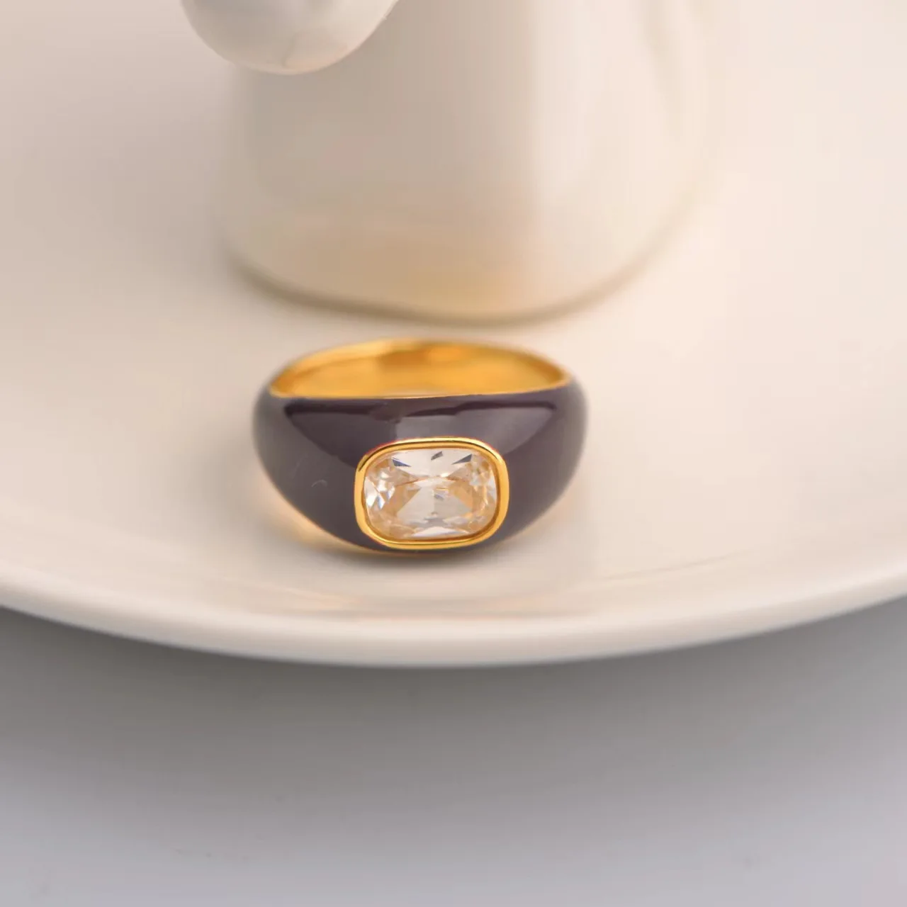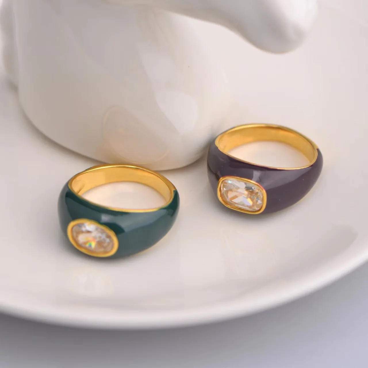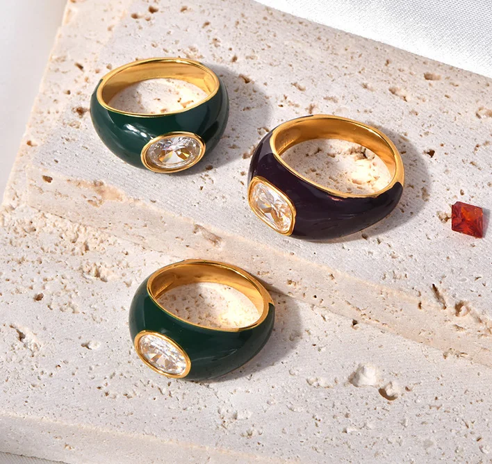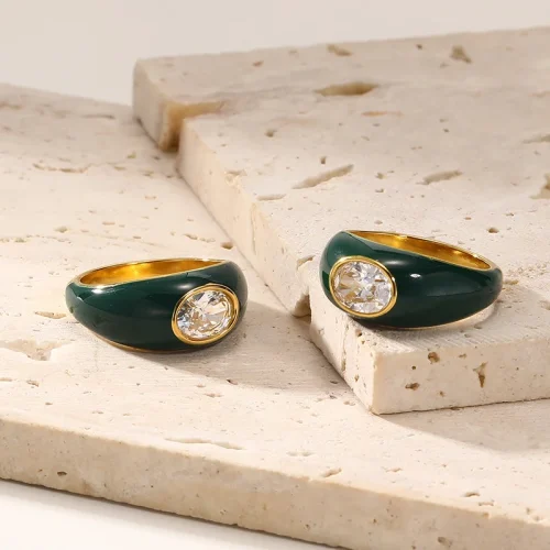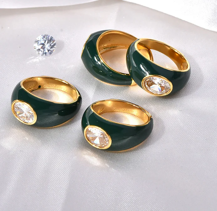 Valentine’s Day Fashion Gold Jewelry Brown Green Enamel Stainless Steel Couple Zircon Rings
