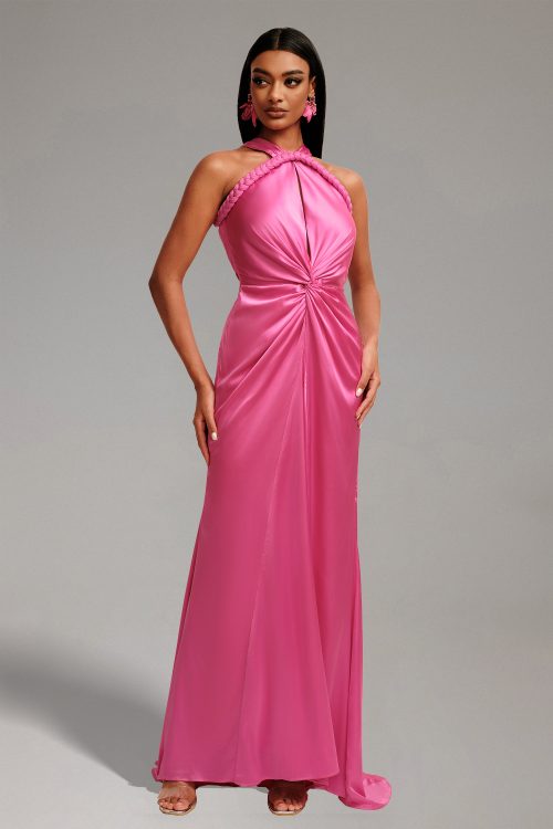 Vanya Woven Halter Cut Out Satin Maxi Dress – Pink