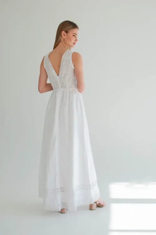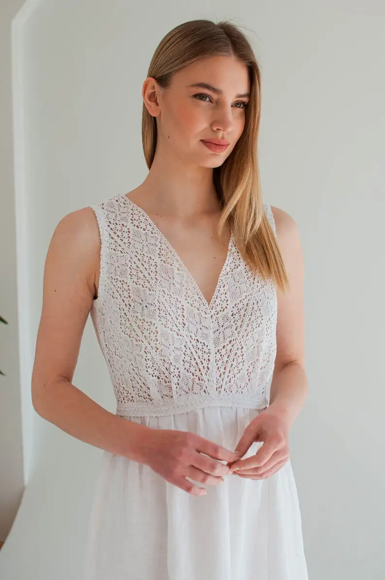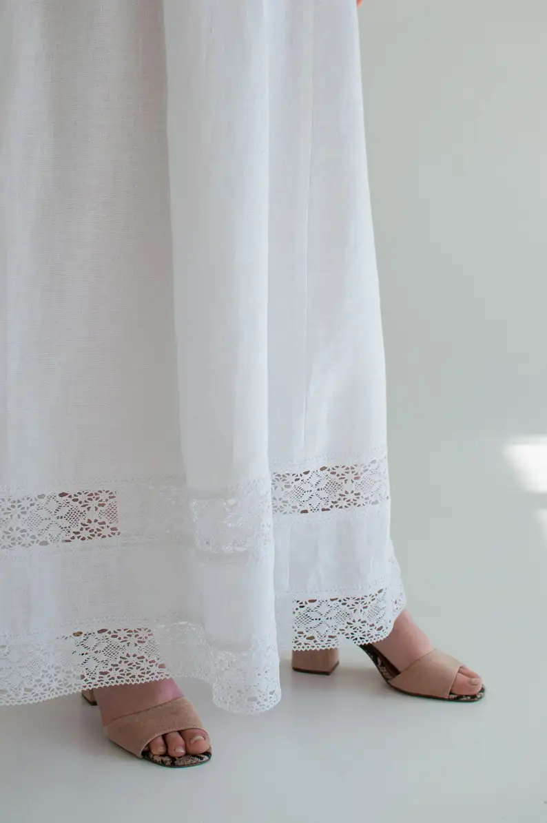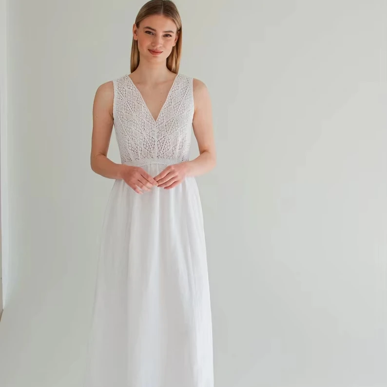 Product Name: White Linen Slip Dress with Lace 100% Cotton Size XS-Breathable Natural Waistline ODM Boho Sundress Women’s Wedding Engagement