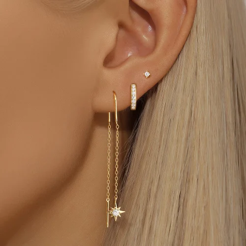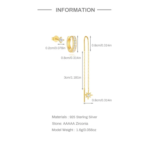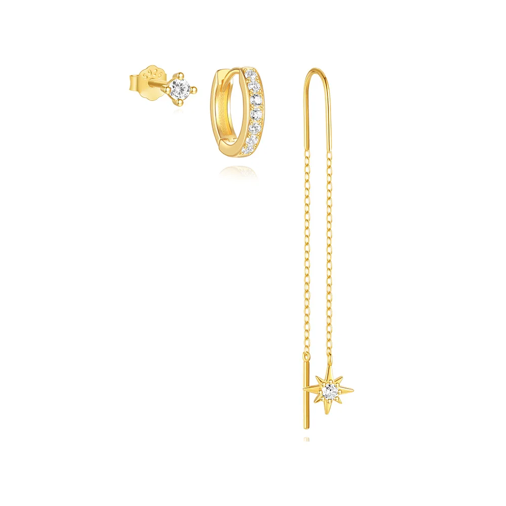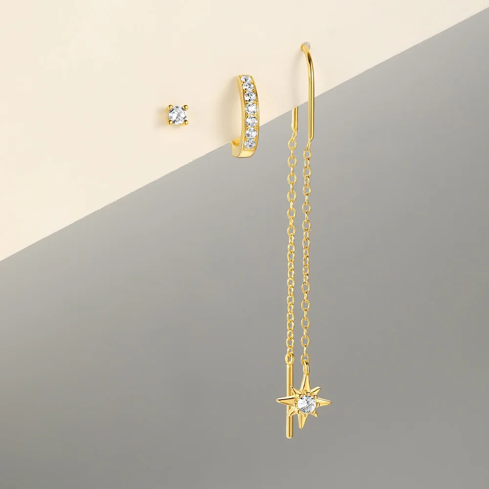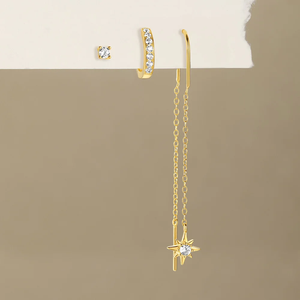 Product Name: With Stamp S925 Silver New Design Gold Plated Geometry Zircon Star Stud Tassel Hoop Earrings Set