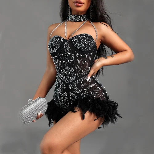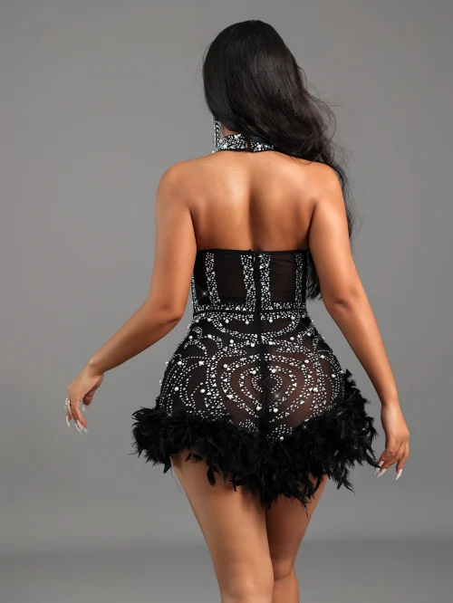 Women Cocktail Dress Elegant Backless Sweetheart Rhinestone Zipper Mini Halter Neck Bodycon Backless Bandage Dresses for Women