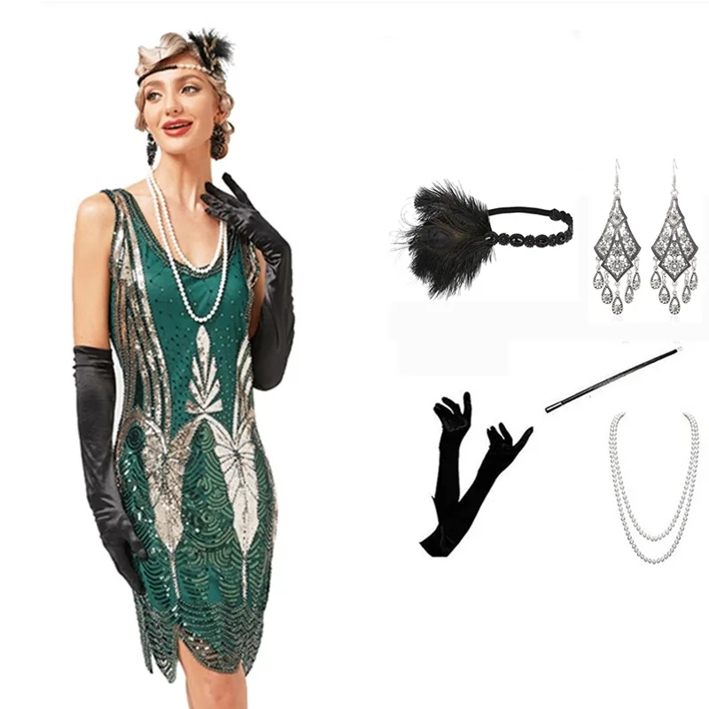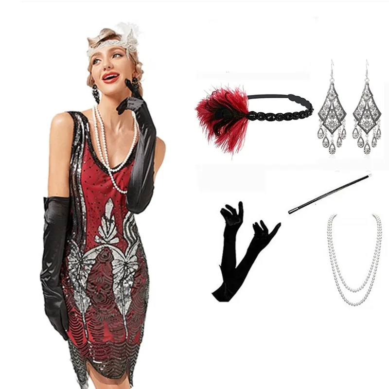 Product Name: Women Sexy Sequin Tassel Casual Dress 1920s Great Gatsby Costume Accessories Set Evething Club Mini Party Dress
