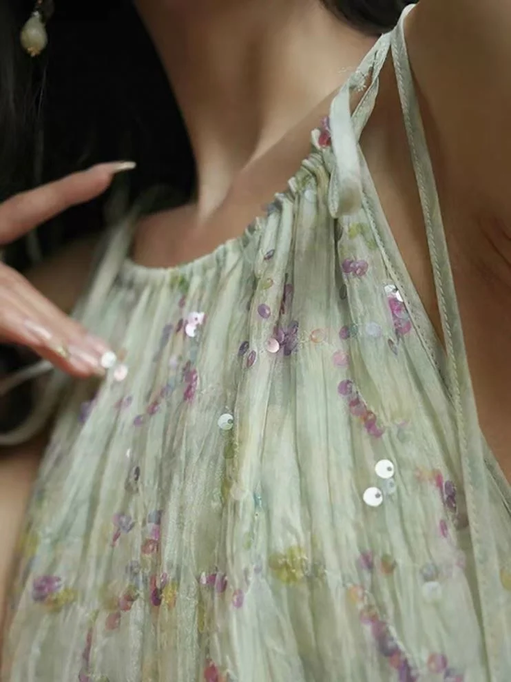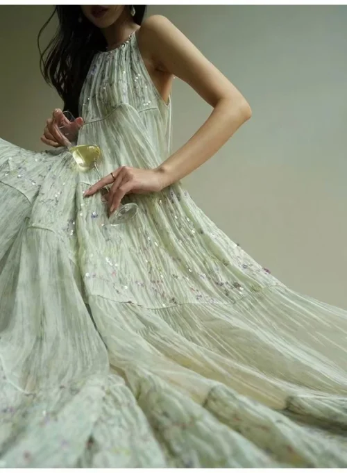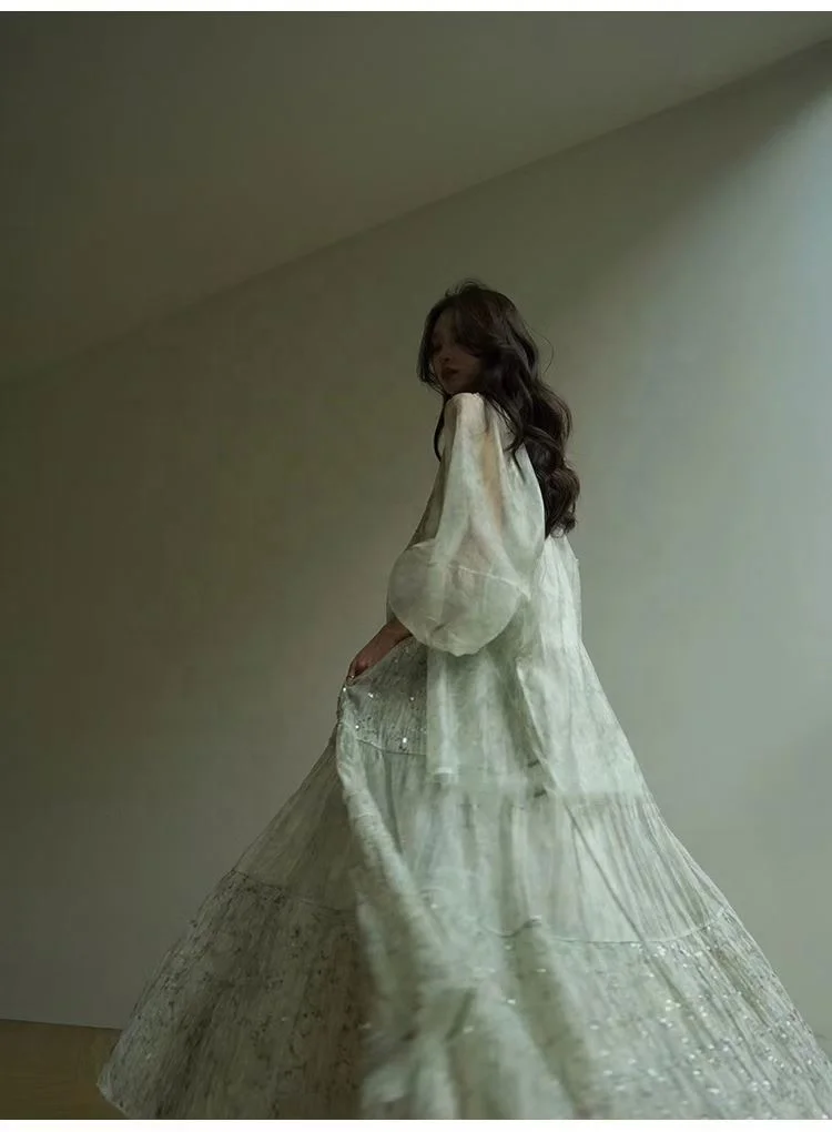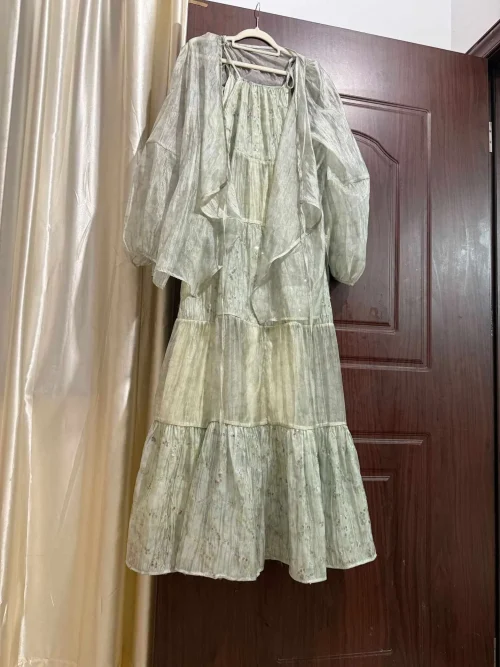 Product Name: Women Spring Summer Midi Casual Dress Ethereal Mint Green Tiered Sequined Embellishments With Long Sleeve Cape Coat