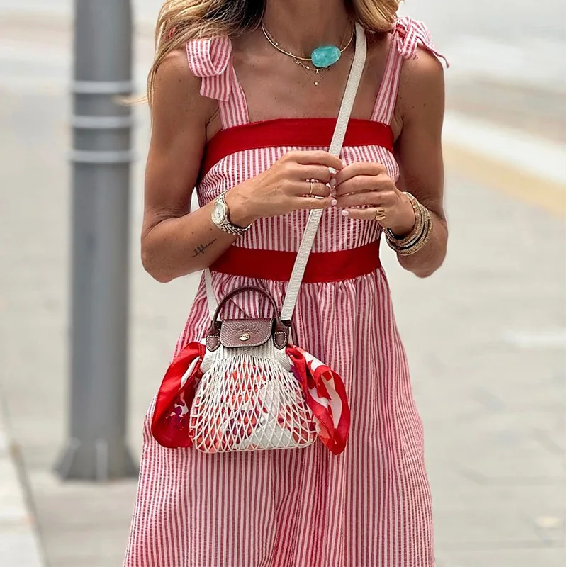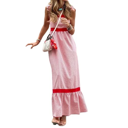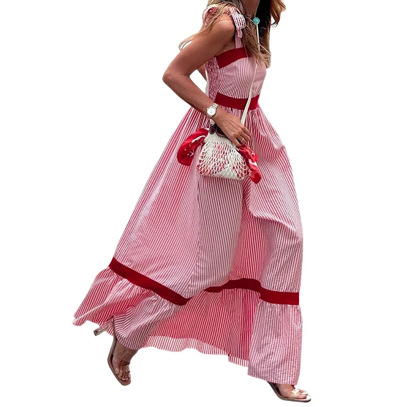 Product Name: Women Striped Patchwork High Waist Dress Fashion Sleeveless Pleated Long Dress Summer Casual Bow Suspenders Vacation Beach Dress