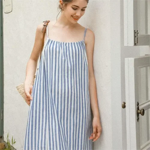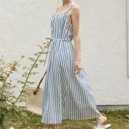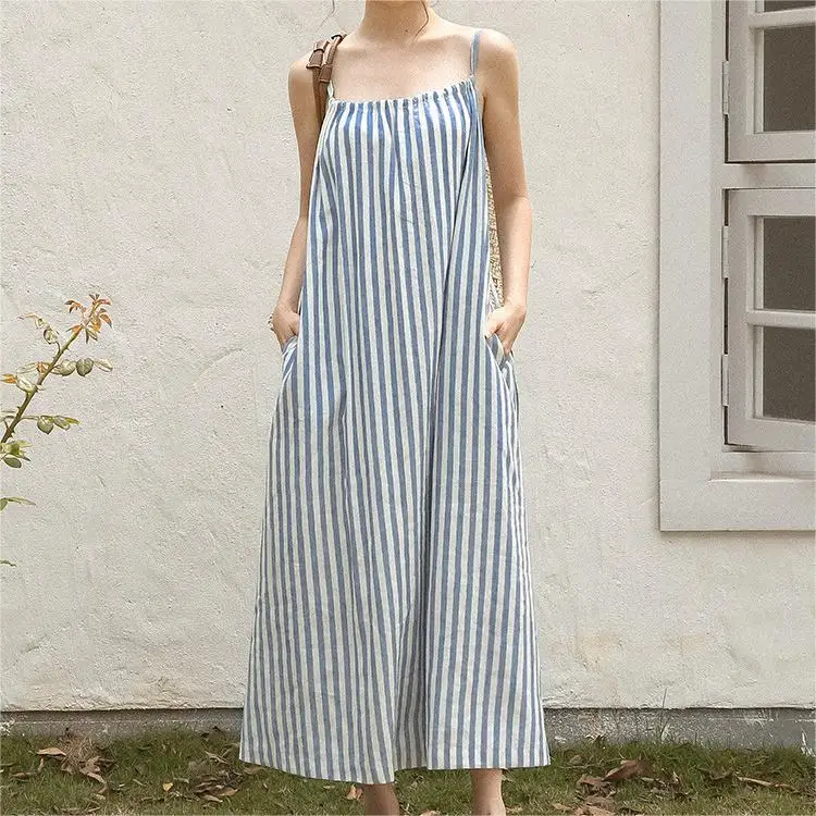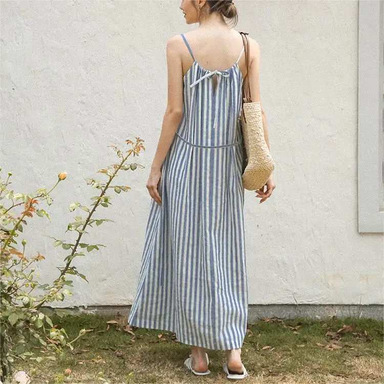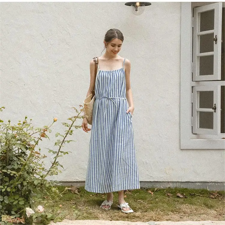 Product Name: Women Striped Spaghetti Slip Sleeveless Dresses Ladies Casual Maxi Long Light Blue Halter Collar Cotton Linen Dress With Pockets