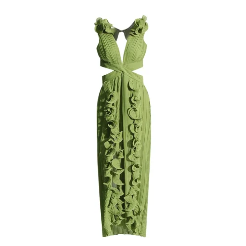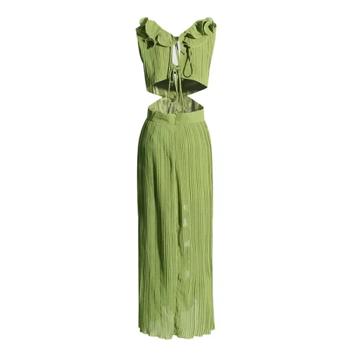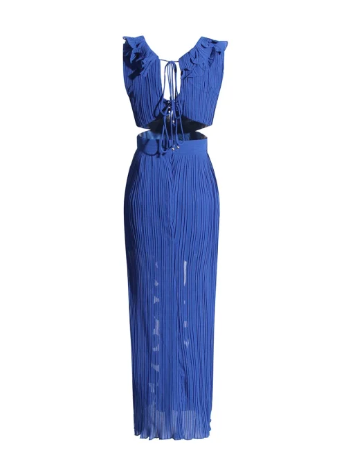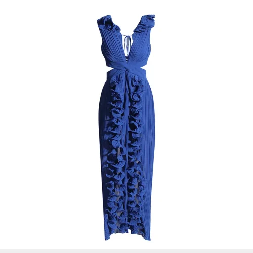 Women Summer Casual Solid Long Dresses Design Fashion V Neck Sleeveless High Waist Patchwork Ruffles Split Pleated