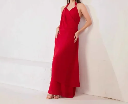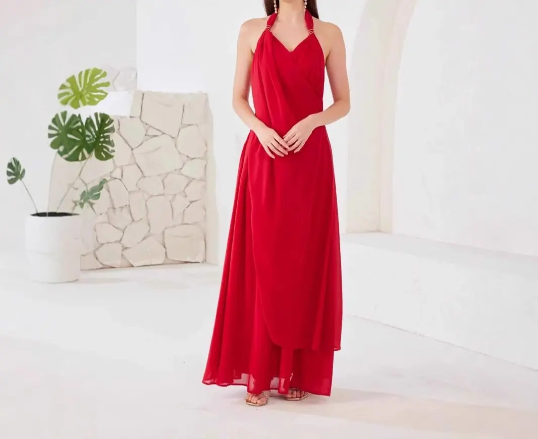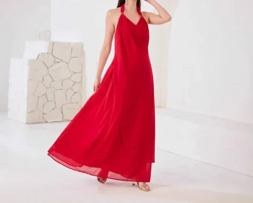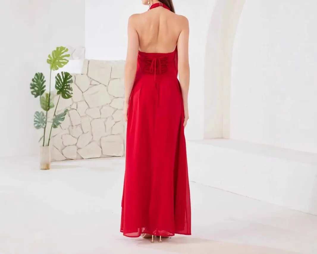 Women Summer Holiday Style V-neck Dress Temperament Solid Color Backless Halter Long Dress