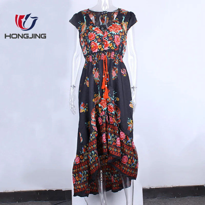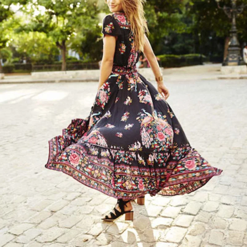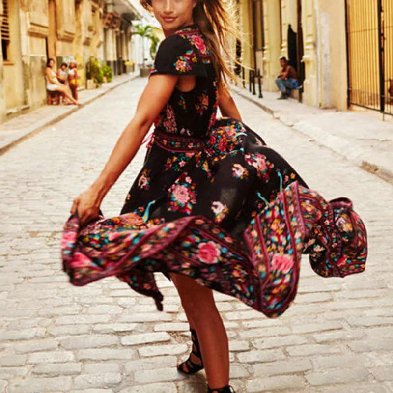 Product Name: Women V-neckline Sexy Floral Rose Bohemian Boho Long Maxi Dress Sundress Travel Beach Dress Front Button Closure Sea Side Dress