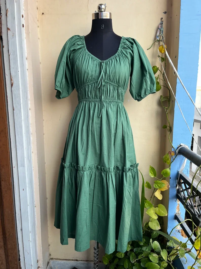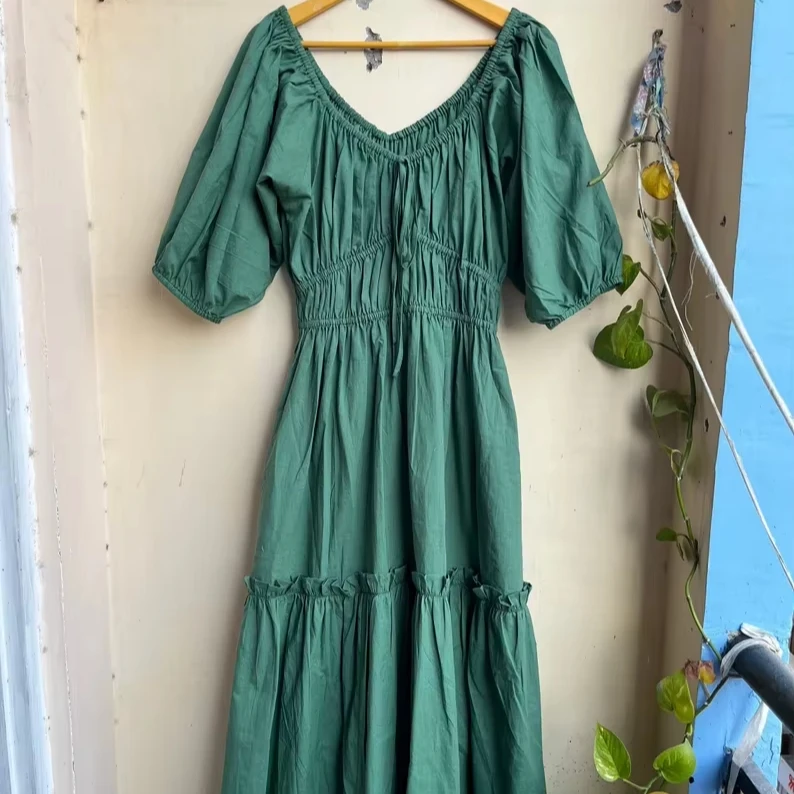 Product Name: Women Wear Green neckline cotton Green Midi Casual Dress Cotton Long maxi Summer Puff Sleeve Dress with pocket Supply