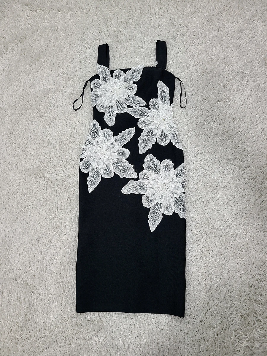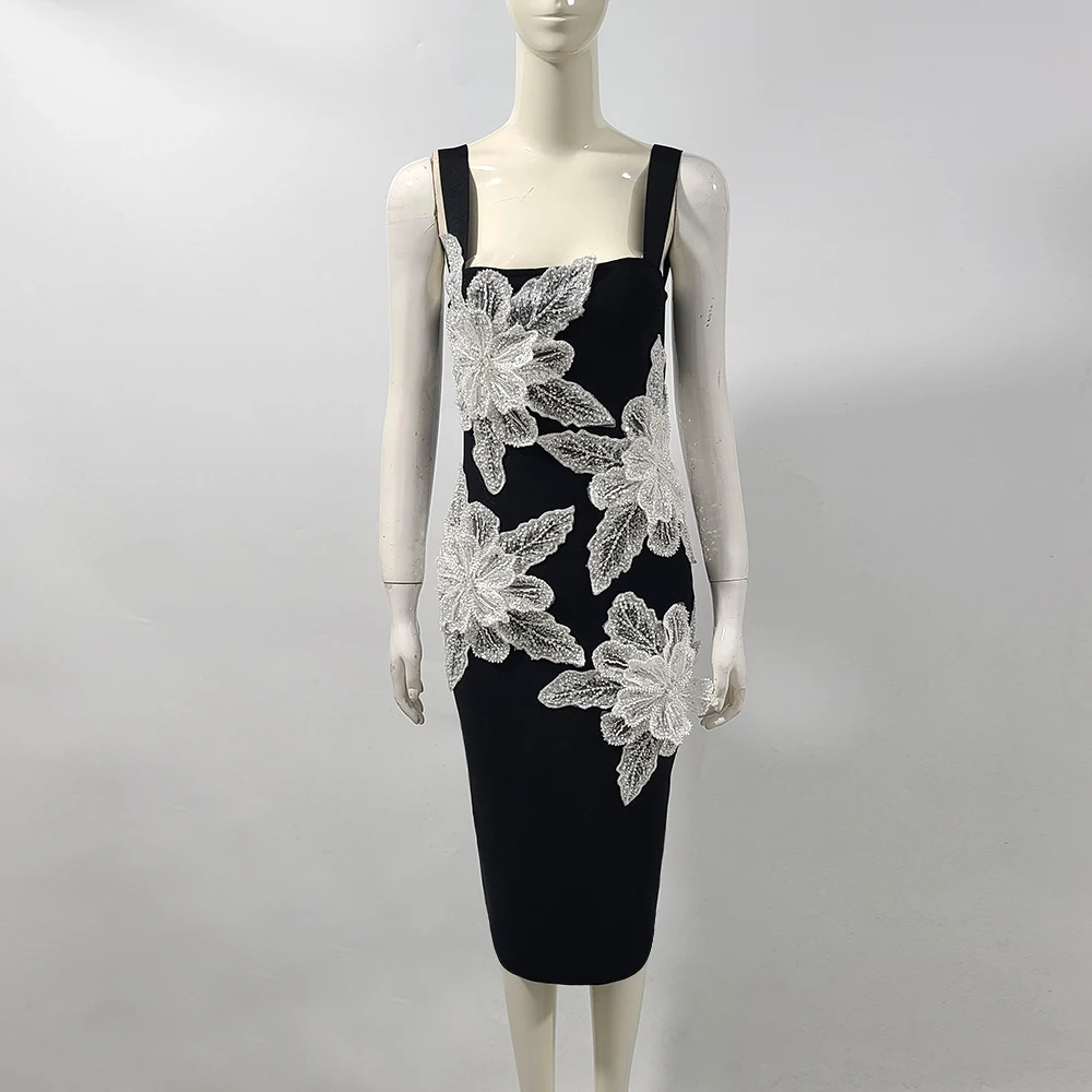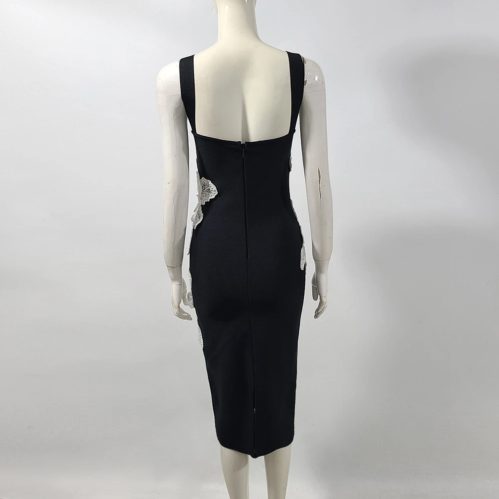 Product Name: Women’s Appliques Flower Spaghetti Strap Backless Design Celebrity Club Party Black Sleeveless Sexy Midi Bandage Dress