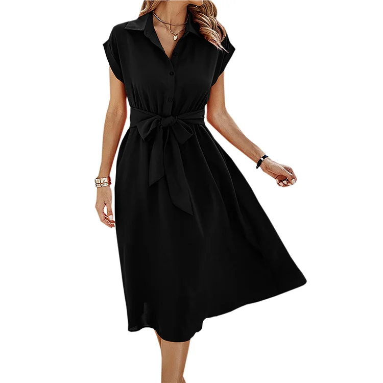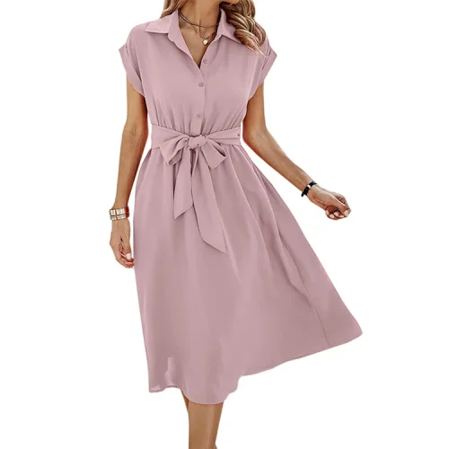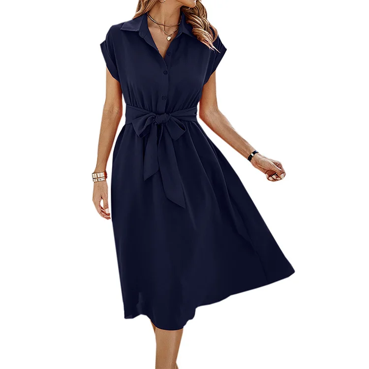 Womens Casual Midi Dresses Solid Turn Down Neck Short Sleeve Button Shirt Dress With Pockets for Spring Summer