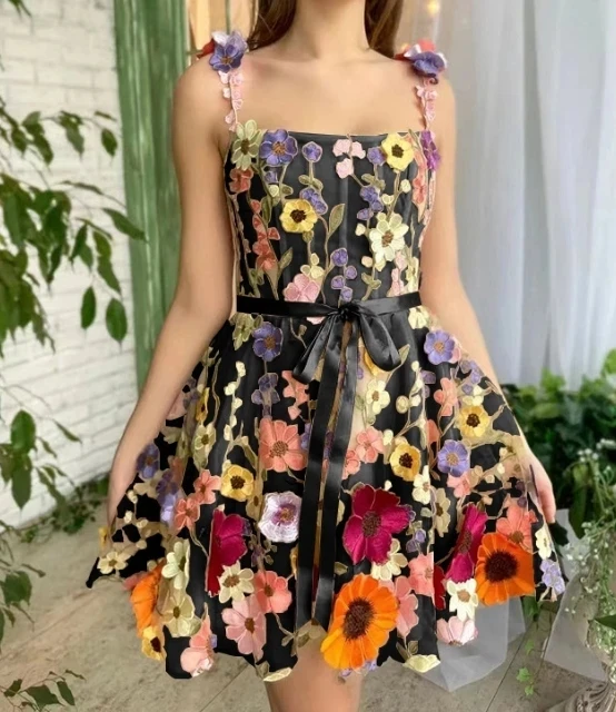 Product Name: Womens Dresses 2024 Summer Fashion 3D Floral Embroidery Casual Square Neck Sleeveless Lace-Up Daily Mini Camisole Dress