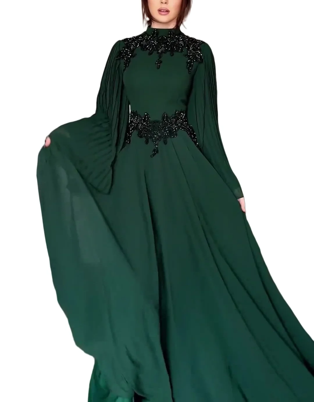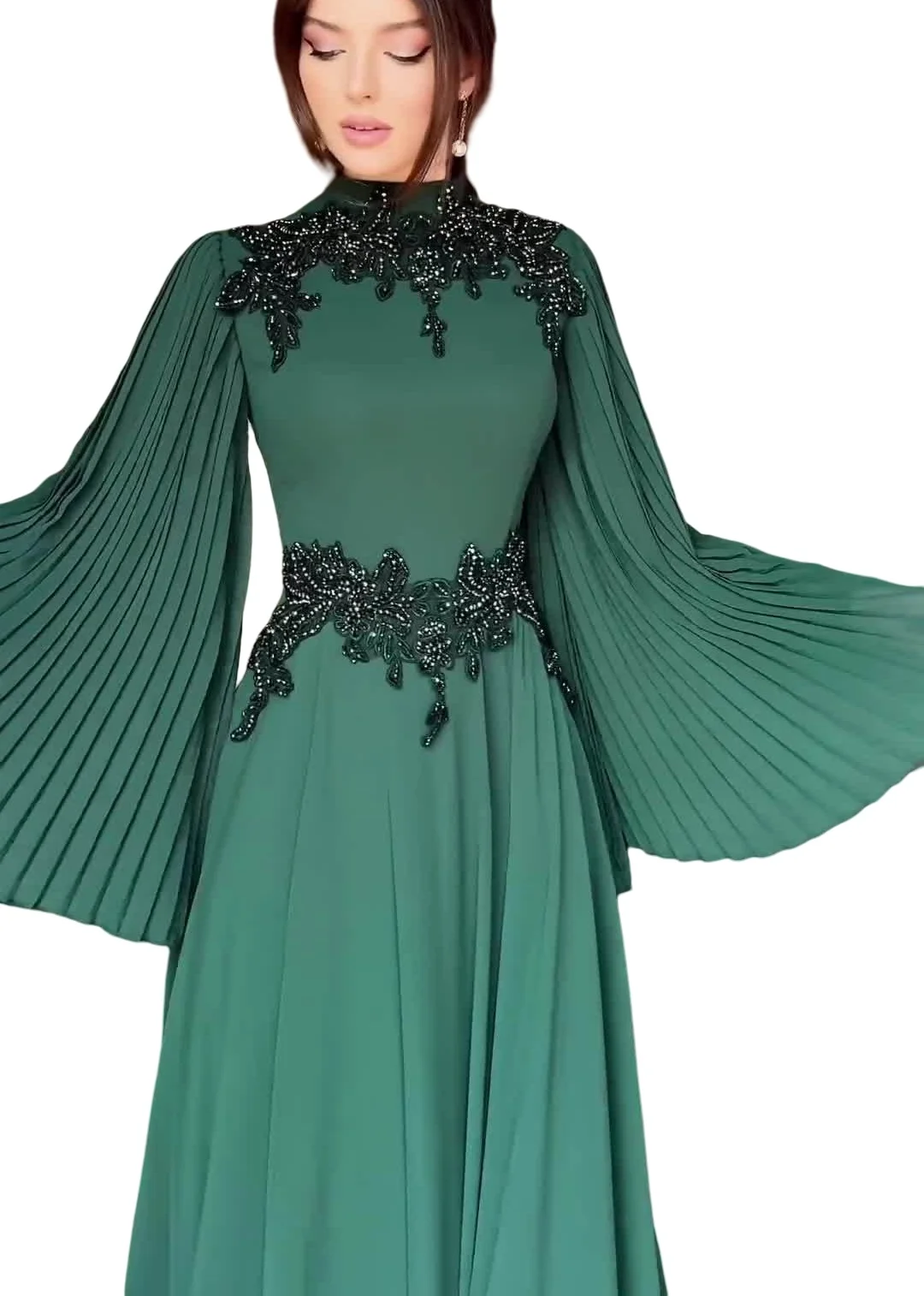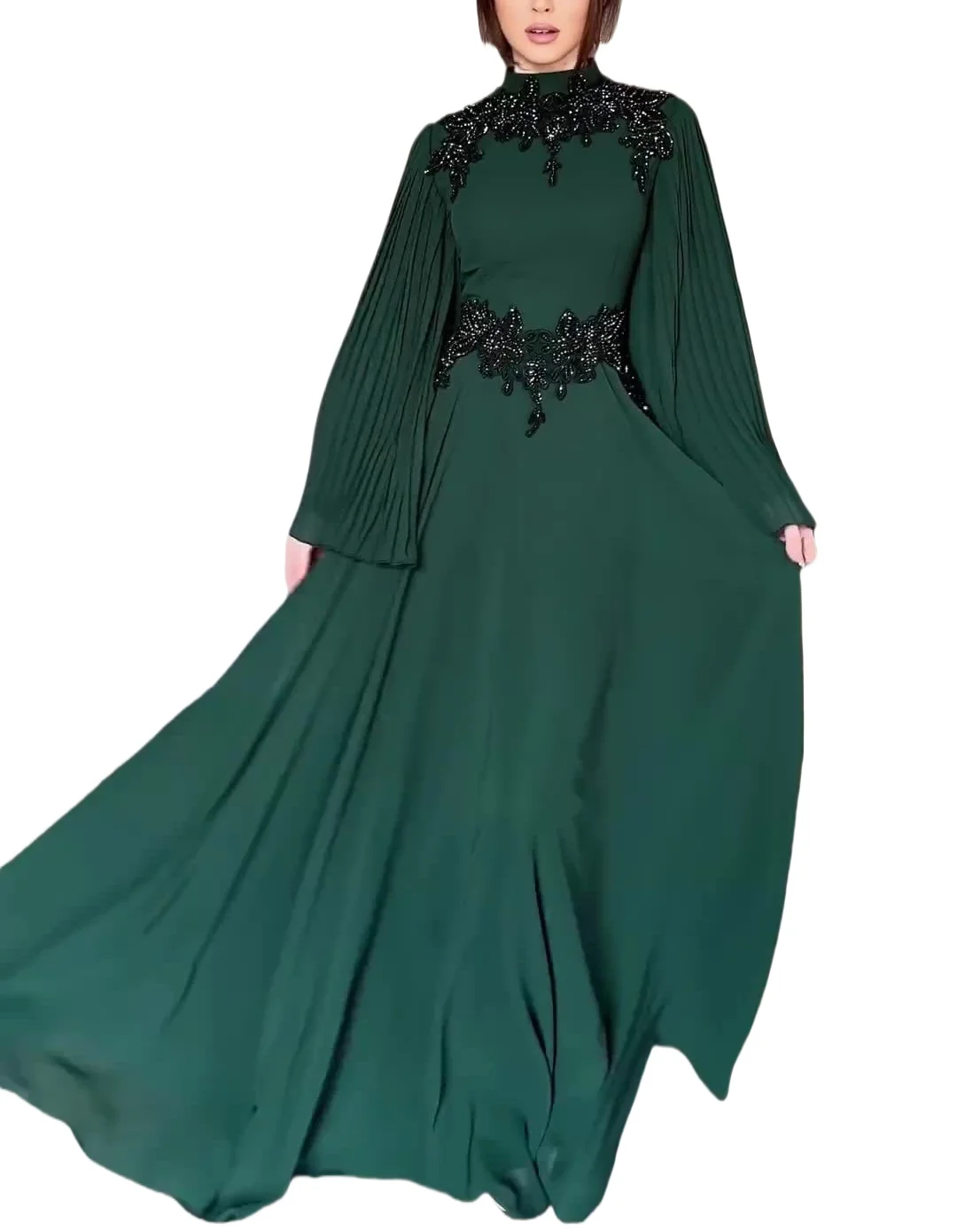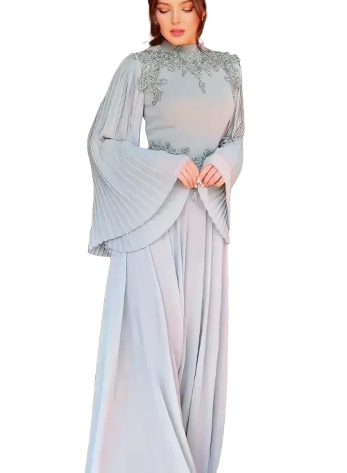 Product Name: Women’s Elegant Pleated Design Long Dress Floral Embroidery Ball Gown Silhouette Chiffon Spring Dot Ruffles Belt for Parties