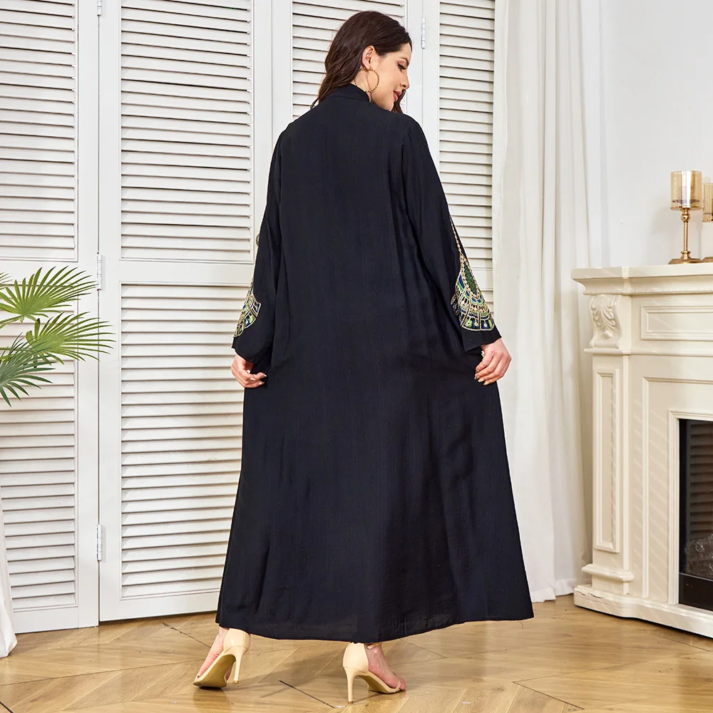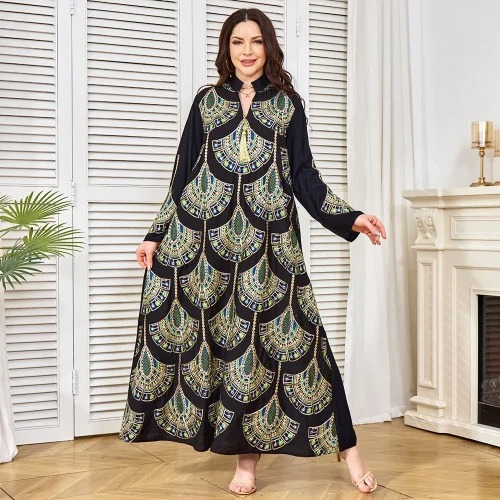 Women’s Elegant Polyester Abaya Long Sleeve Sequin Dress with Open Collar Casual Loose Party Gown for Autumn