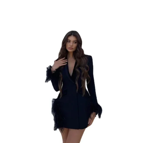 Product Name: Women’s High-End All-Match Feather Dress Deep V Neck Long Sleeve Ostrich Hair Buttoned Midi Length Party Casual Solid Autumn