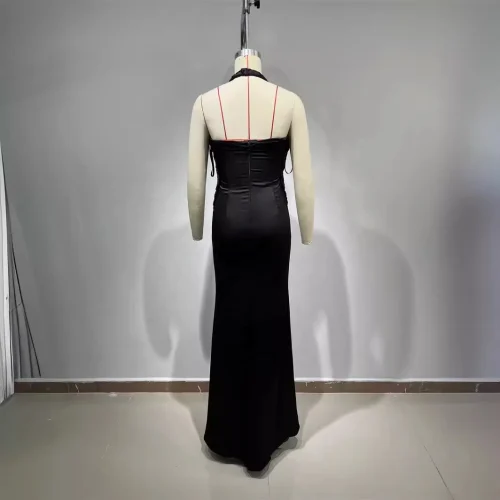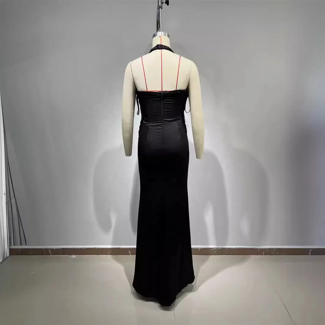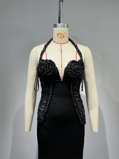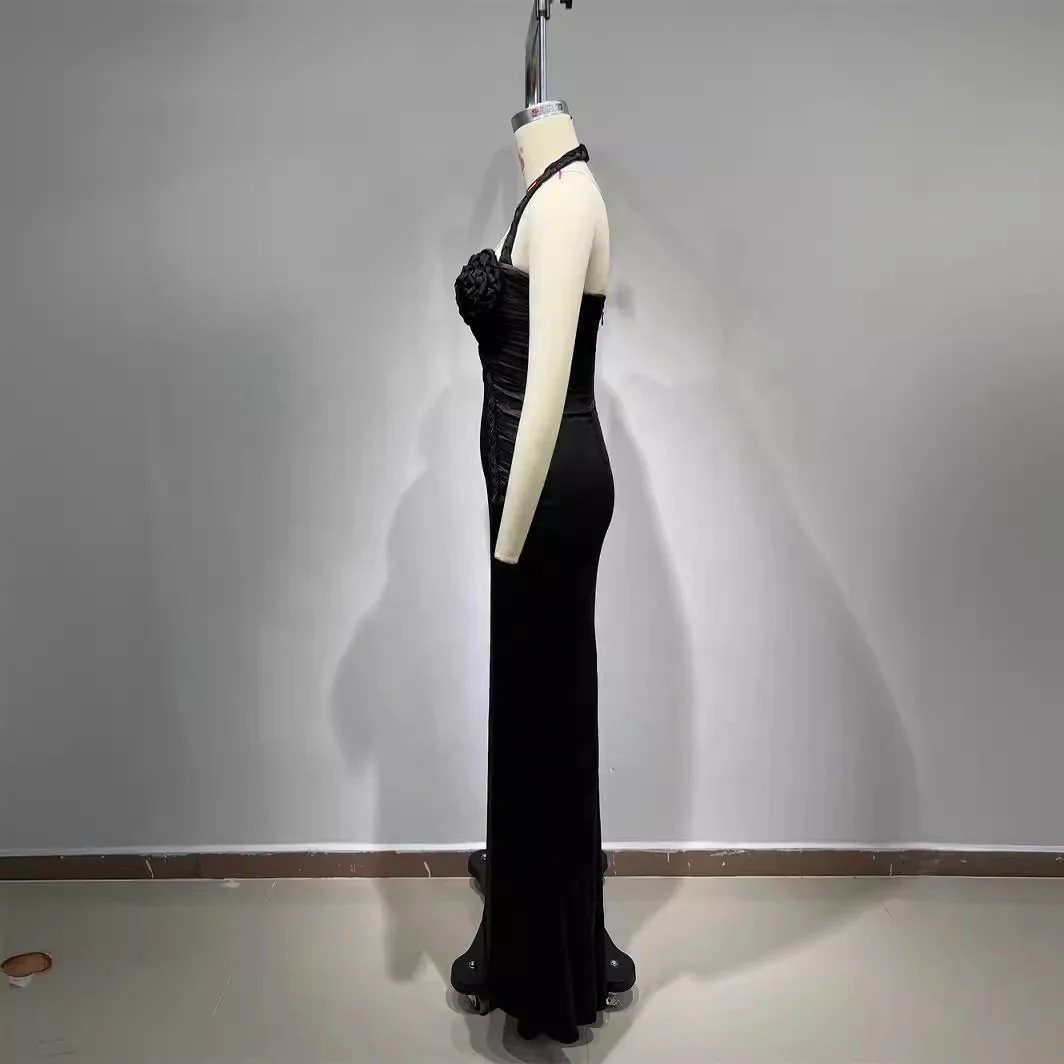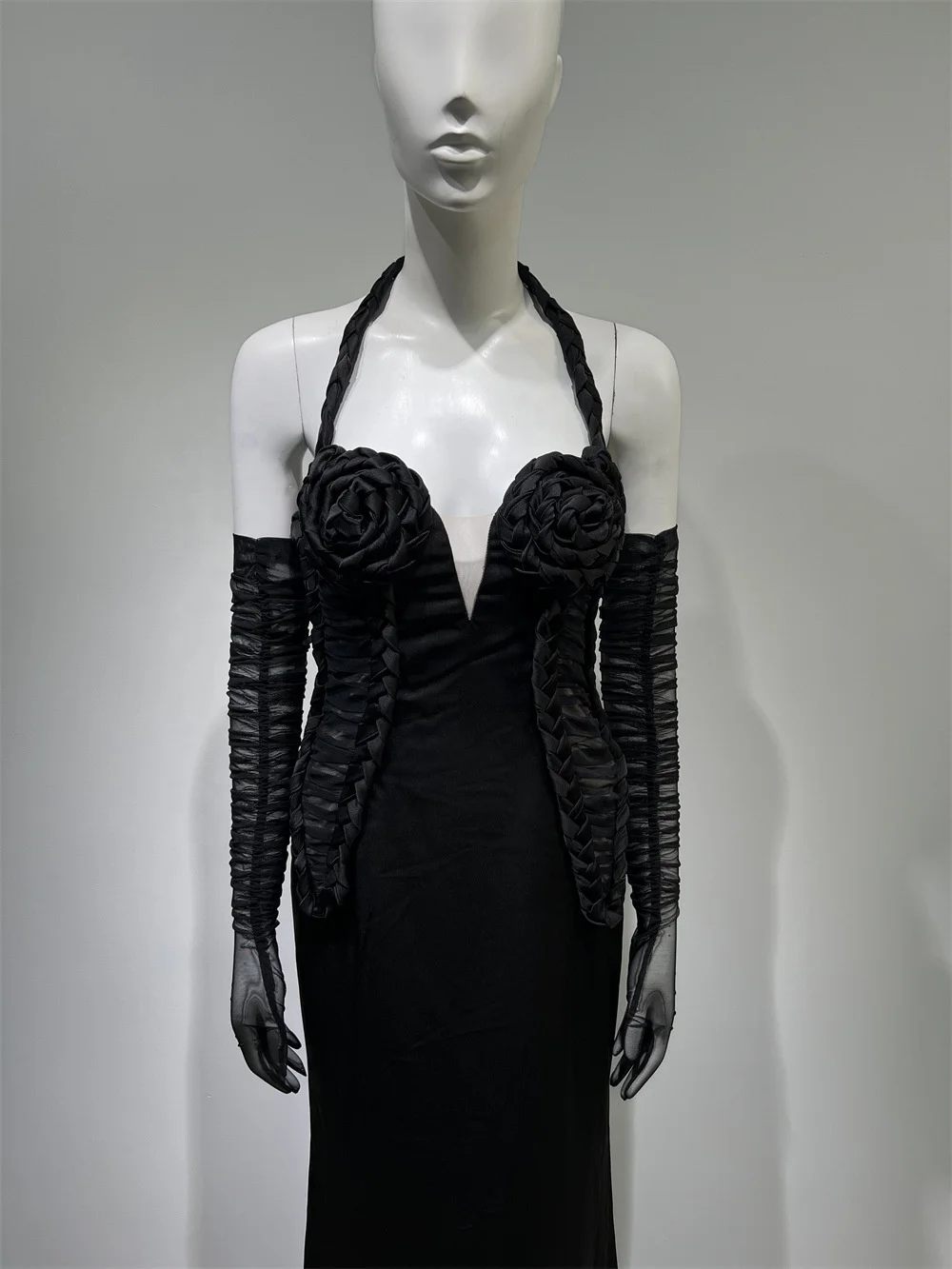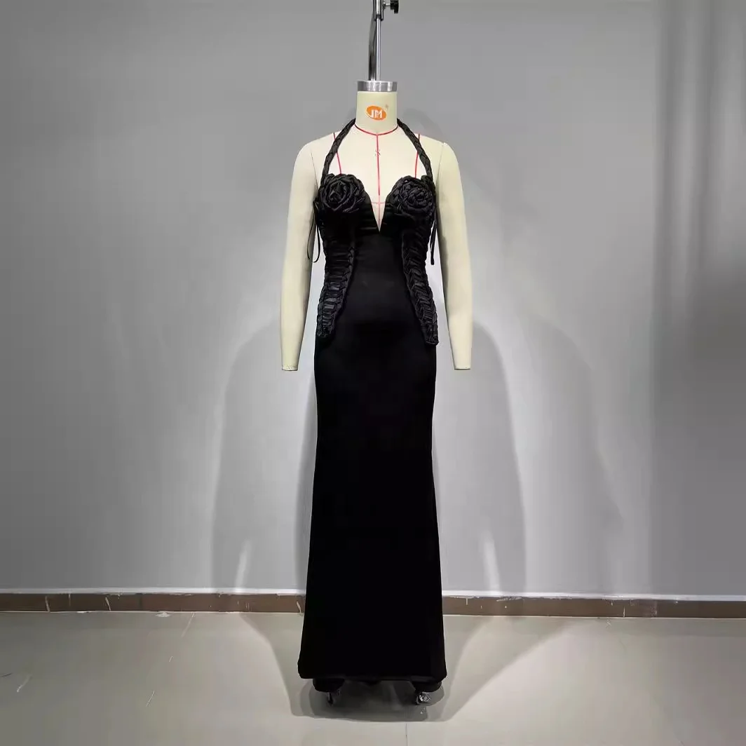 Women’S Sexy V-Neck Open Back Flower Braid Design Black Maxi Long Elegant Celebrity Party Evening Dress With Gloves Vestidos