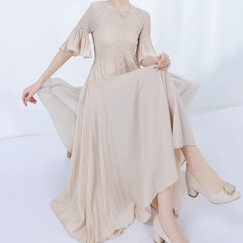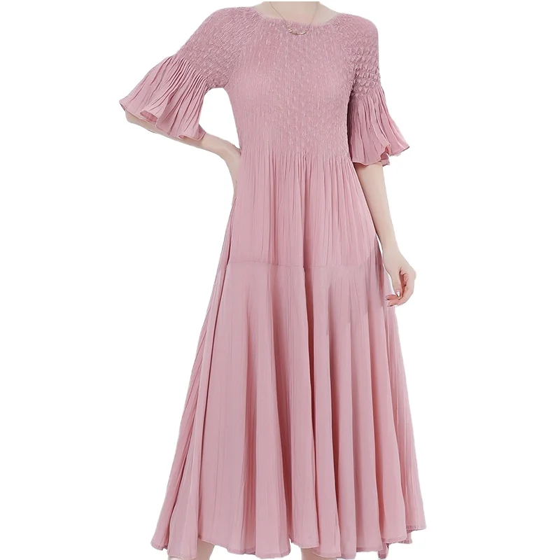 Product Name: Women’s Short Sleeve High Waisted Pleated Dress Summer Breathable Solid Color Miyake Dress Woven Weaving Method