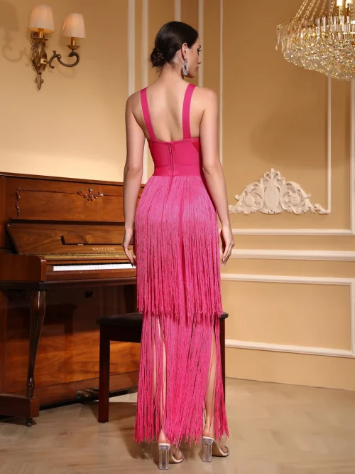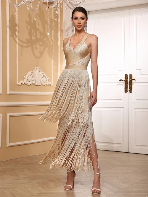 Product Name: Women’s Slim-Fit Banquet Red Carpet Dress Two-Color Pleated Fringe Deep V High-Set Stars for Day Parties Summer