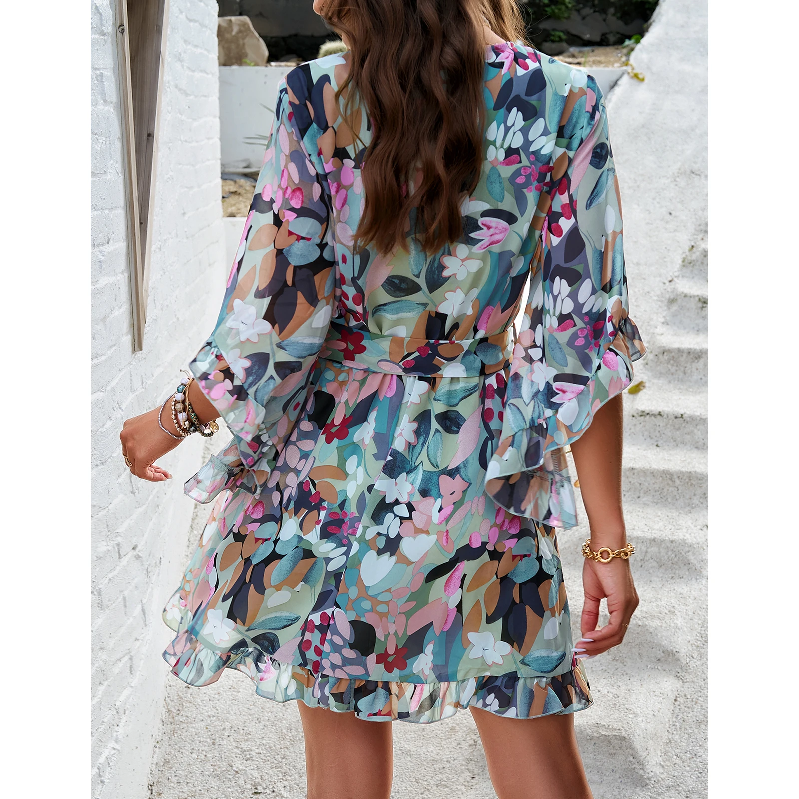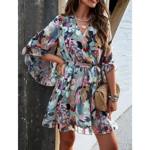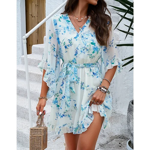 Product Name: Womens Summer Chiffon Floral Beach Dress Sundress a Linie 3/4 Short Sleeves Semi-formal Knee Length Dresses Casual 2025 Outfit