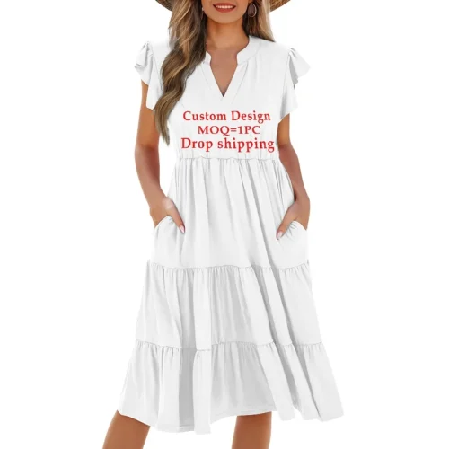 Womens Summer Ruffle Sleeve V Neck Midi Dress 2024 Casual Fit Tiered Polynesian Tribal Samoa Beach Vacation Sundress with Pocket
