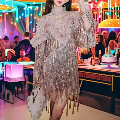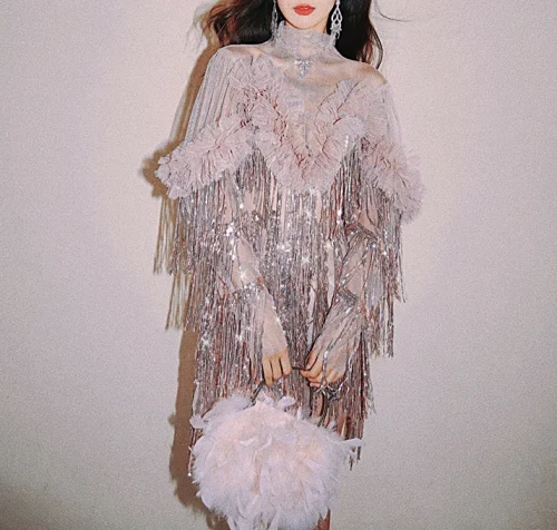 Product Name: Women’s Vintage Casual Dress with Mini Tassel Pink Mesh Sequin Fringe Trim for Party & Club