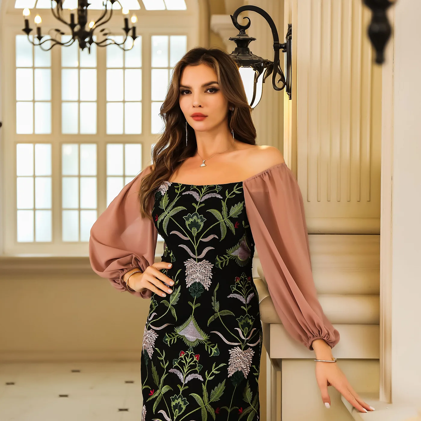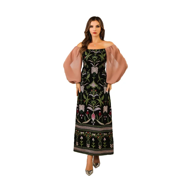 Product Name: Women’s Vintage Floral Embroidered Robe Dress Maxi Length Streetwear Style with Sequins Plain Dyed Natural Waistline
