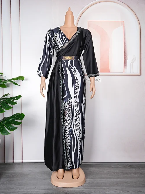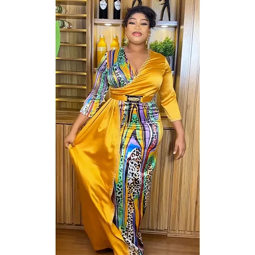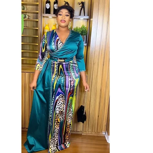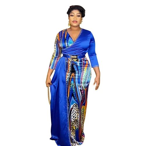Product Name: XINPAI-N121 New European American African Color Block V-Neck Long Dress Summer Casual Chiffon for Plus Size Dress