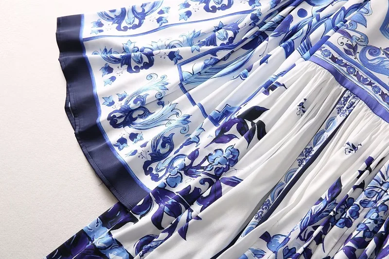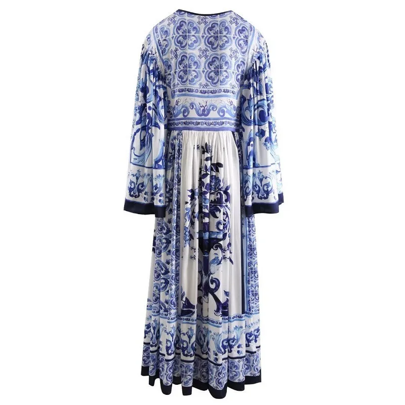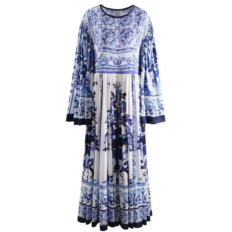 Product Name: XXL Long Dress 2023 Autumn Style Women O-Neck Vintage Porcelain Prints Flare Sleeve Casual Bohemian Beach Long Maxi Dress Blue