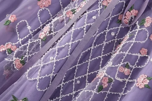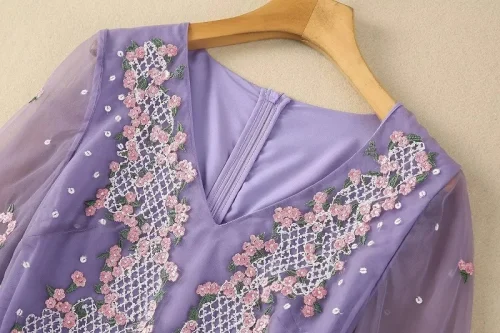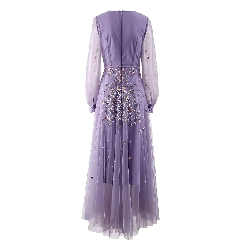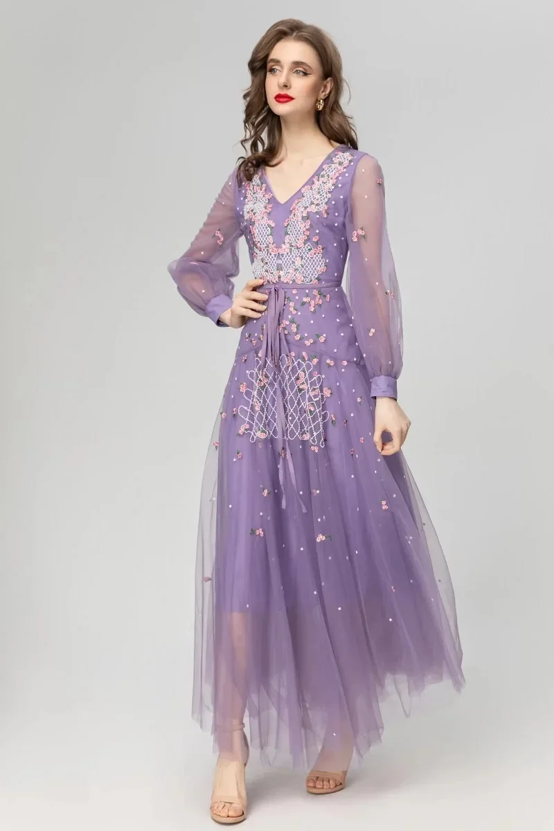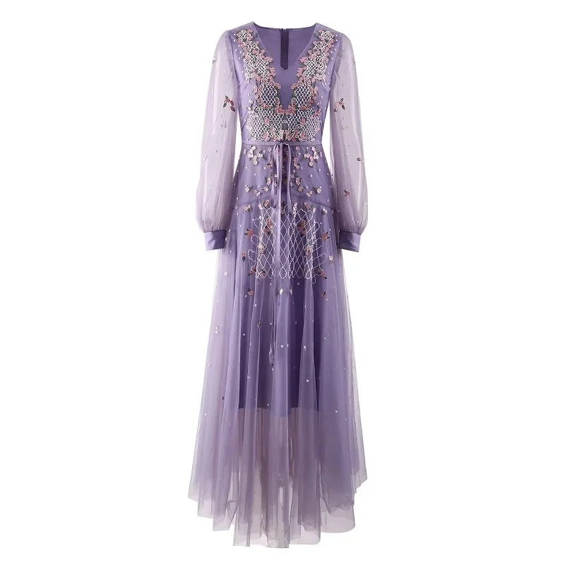 Product Name: XXL Long Embroidery Dress 2024 Spring Wedding Party Women V-Neck Luxurious Embroidery Sequined Long Sleeve Maxi Dress Purple