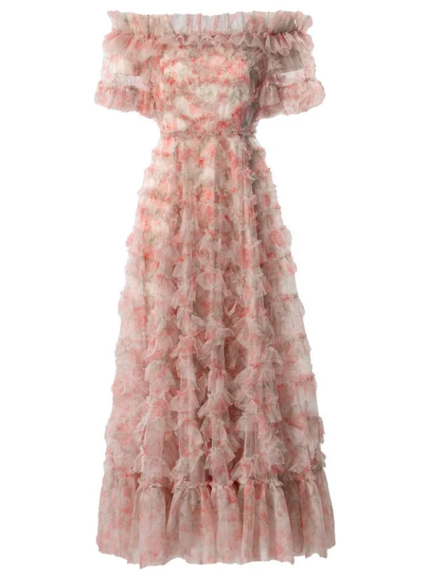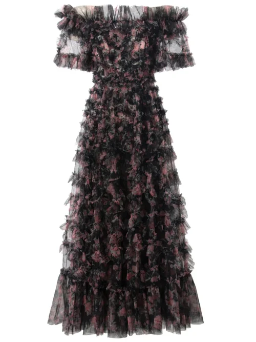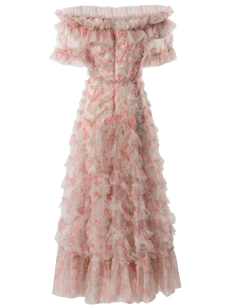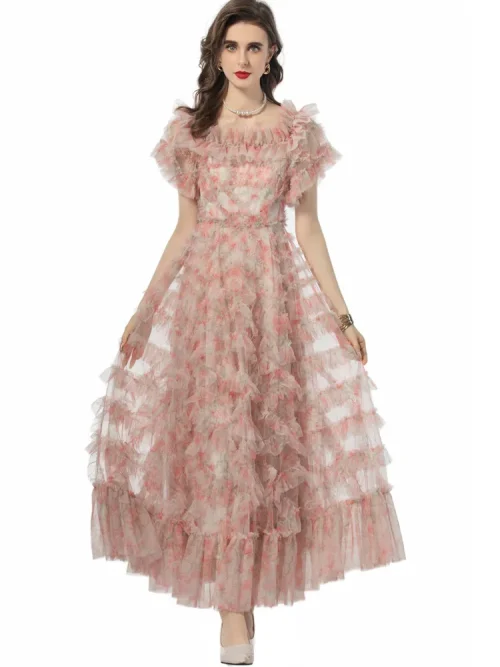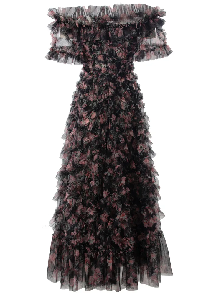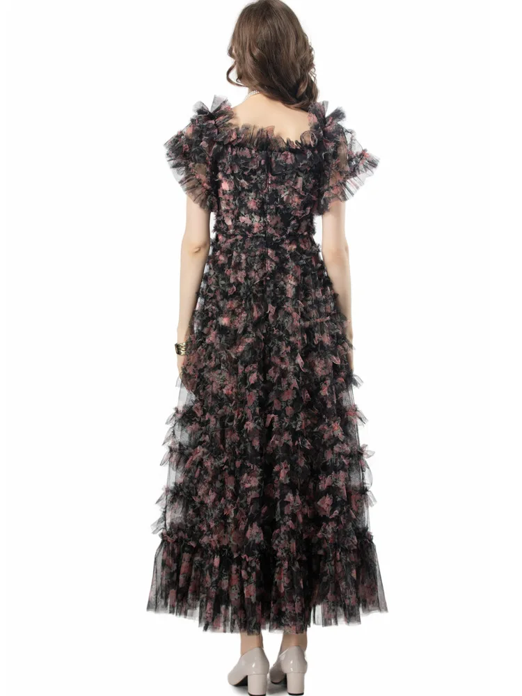 Product Name: XXXXL Long Evening Dress 2024 Summer Wedding Party Ladies Allover Cascading Ruffle Floral Short Sleeve Black Princess Gown Dress