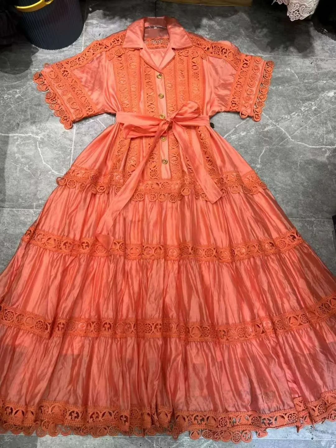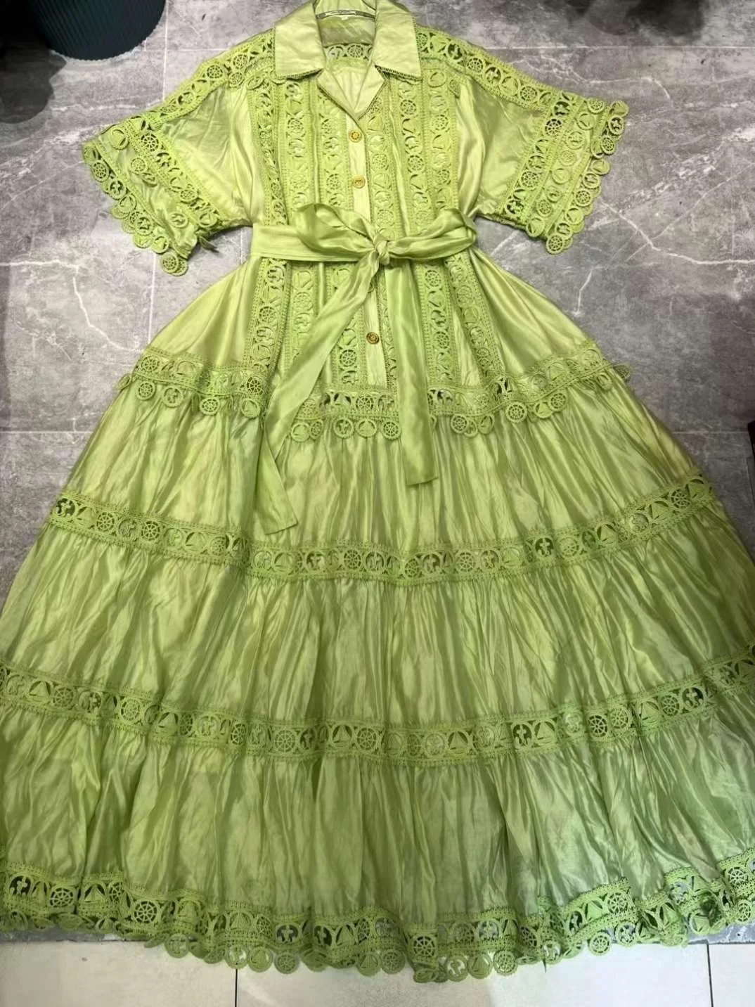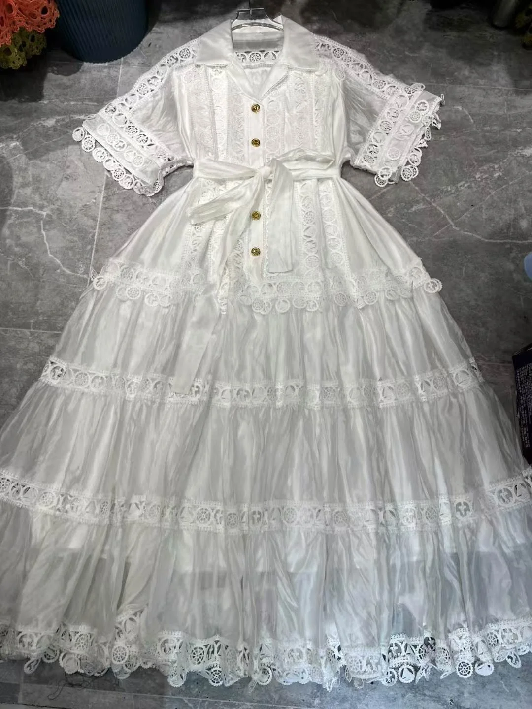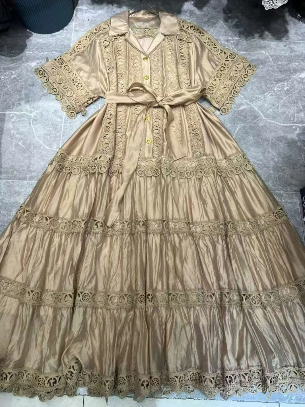 Product Name: YC Fashion Designer Loose Long Dress Women 2025 Spring Summer Turn-down Collar Flower Embroidery Hollow Out Casual Party
