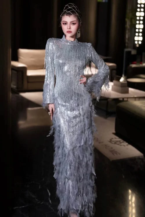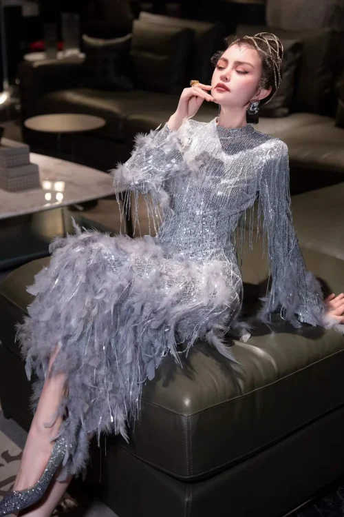 Product Name: YC High Quality Evening Dress Women Spring Summer Sequined Beading Tassel Feather Slim Ceremony Party Banquet Birthday