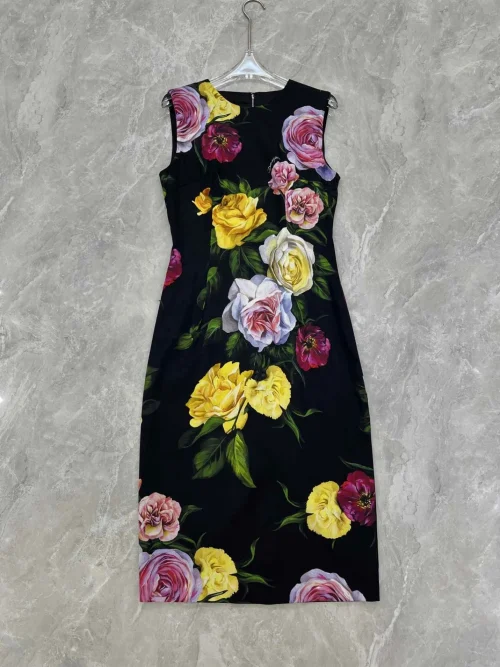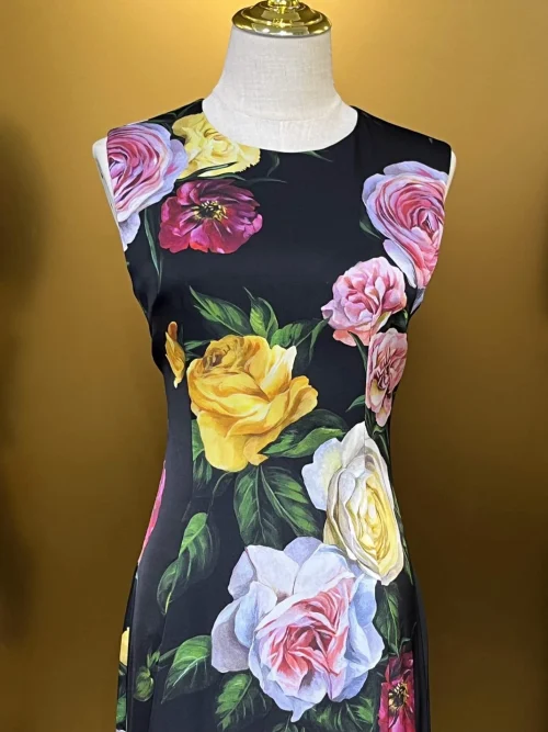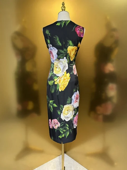 Product Name: YC High Quality Summer Sicilian Dress Women 100% Silk Sleeveless O-Neck Colorful Rose Peony Printed Slim Pencil Elegant