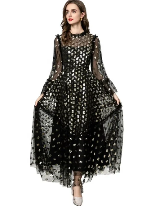 Product Name: YC Women’s O-Neck Flare Sleeve Sequins Embroidery Mesh Purple Ball Gown Long Dresses Fashion Spring New