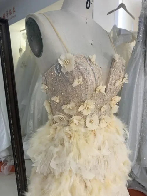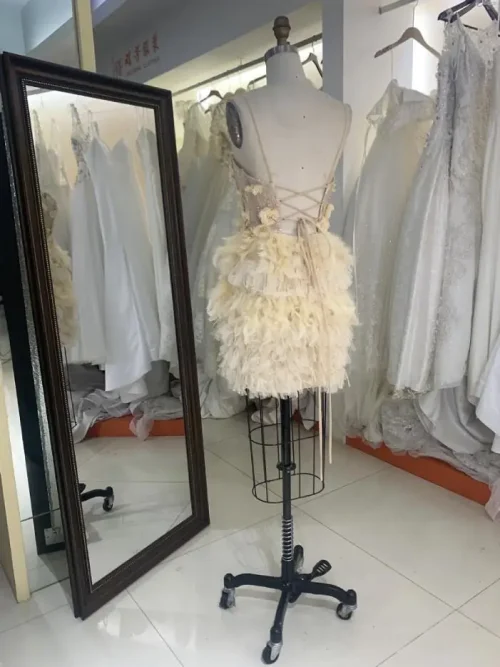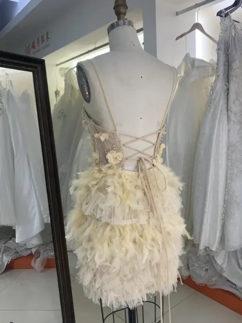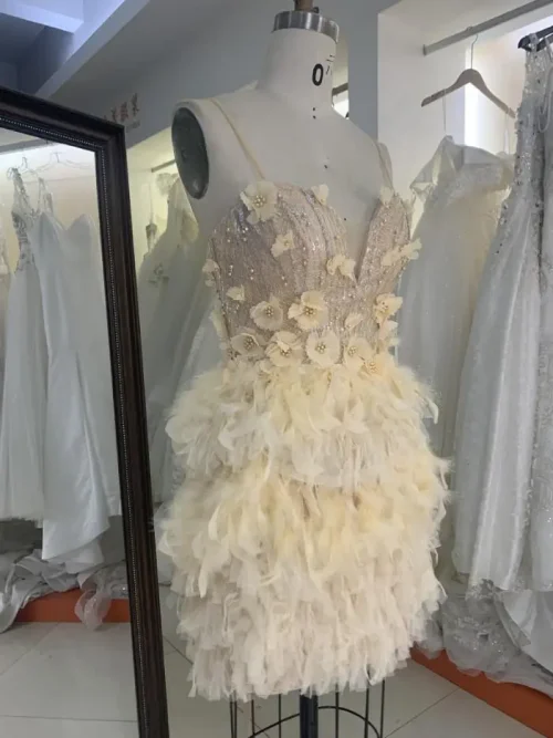 Product Name: Yellow Feather 3D Flower Spaghetti Strap Homecoming Short Dress for Girls