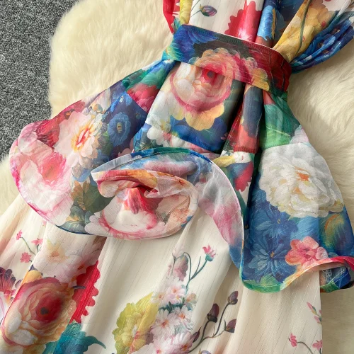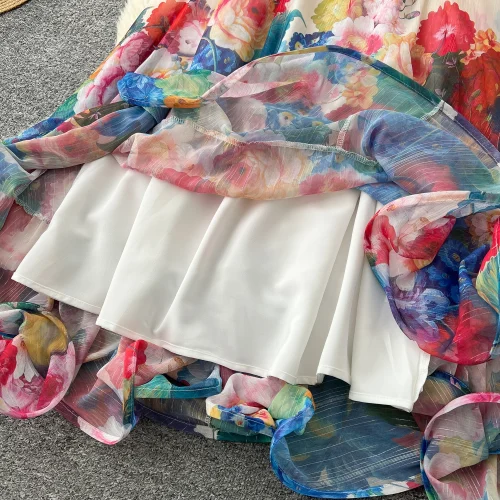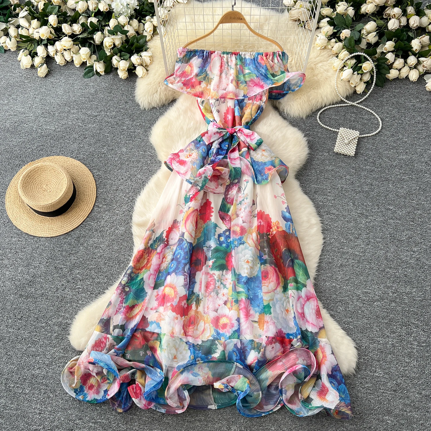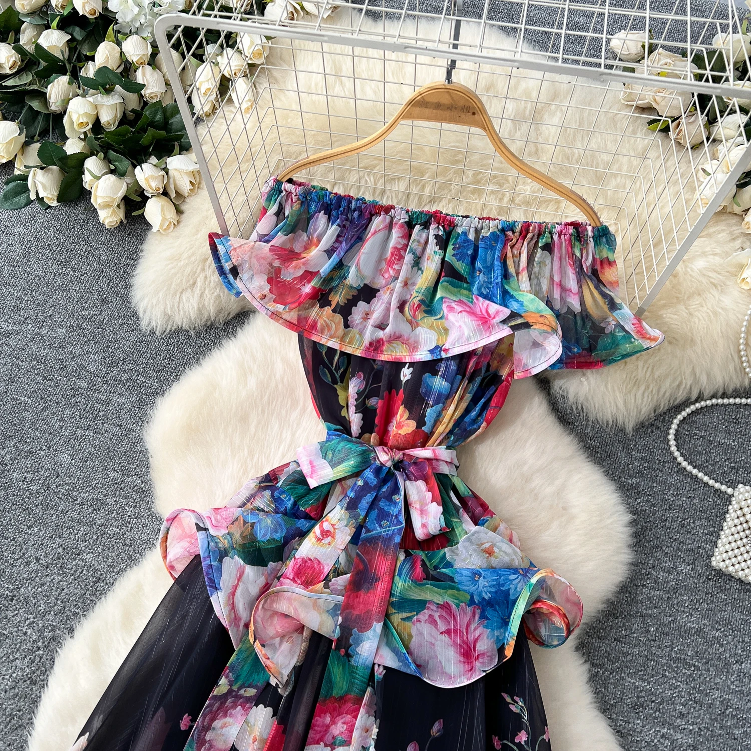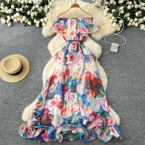 ZR10177 2025 Spring New Holiday Style Dress Women Line Shoulder Waist Slimming Temperament Printed Ruffled Edge Dress Women