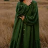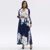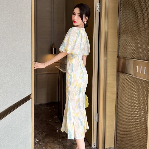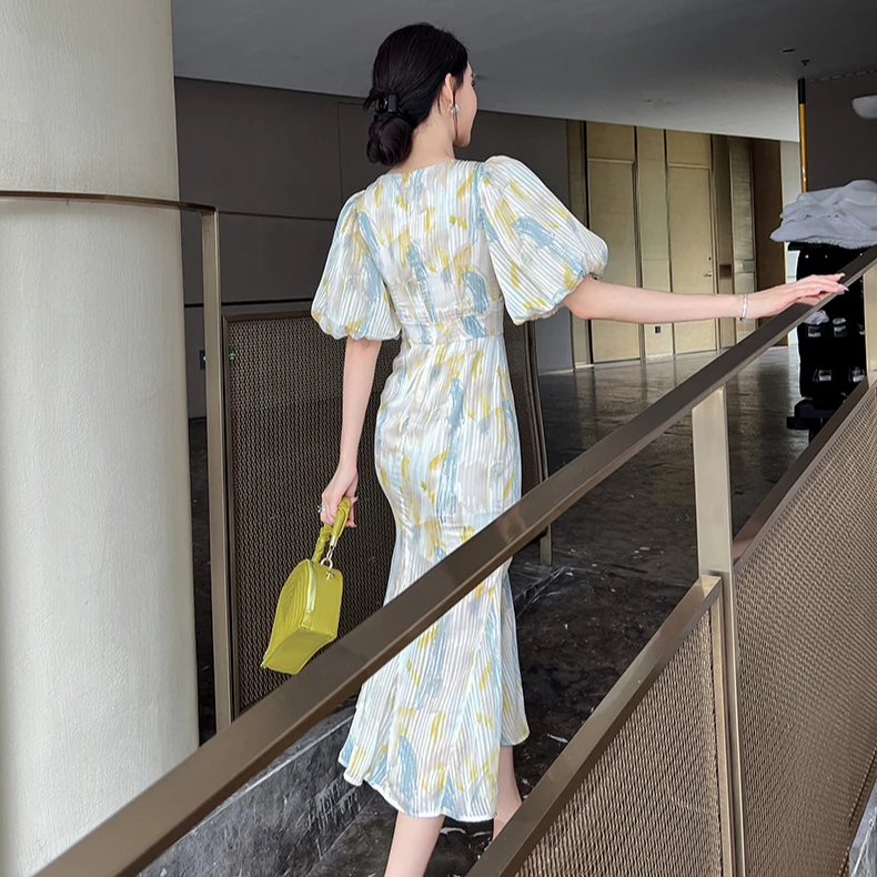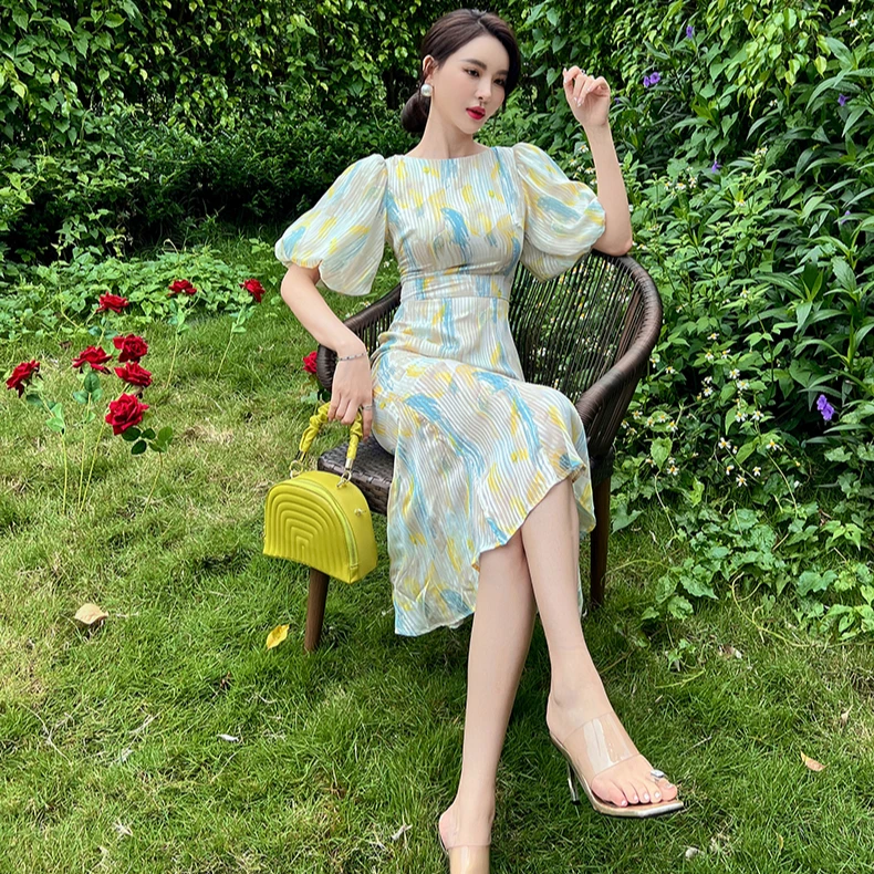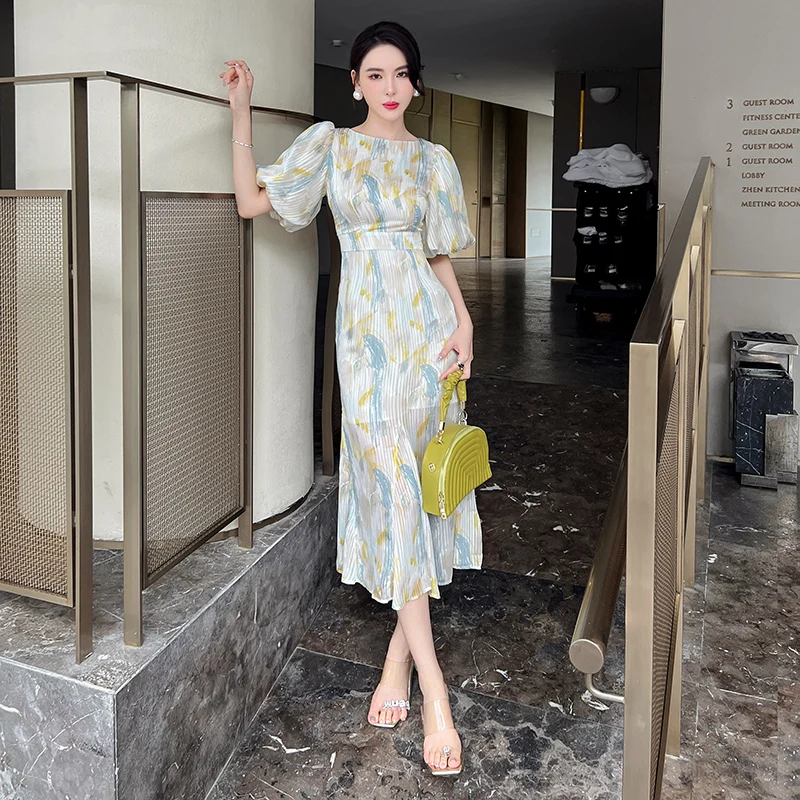 ZYHT 20050 Daily Life Printed Women Casual Long Dress Puff Lantern Sleeve Double-layer Elegant Satin Dress