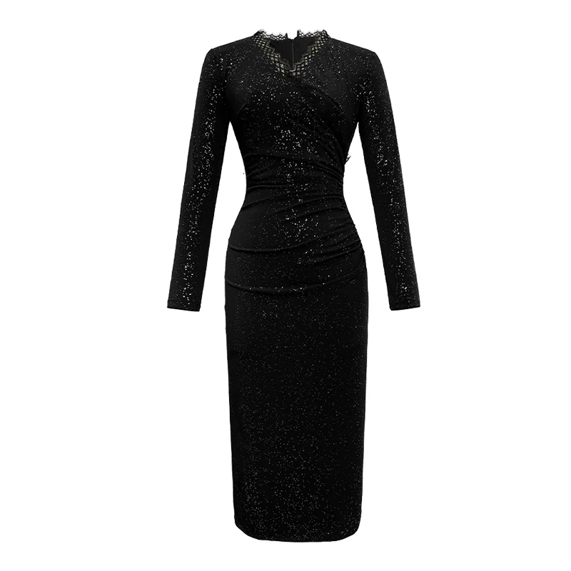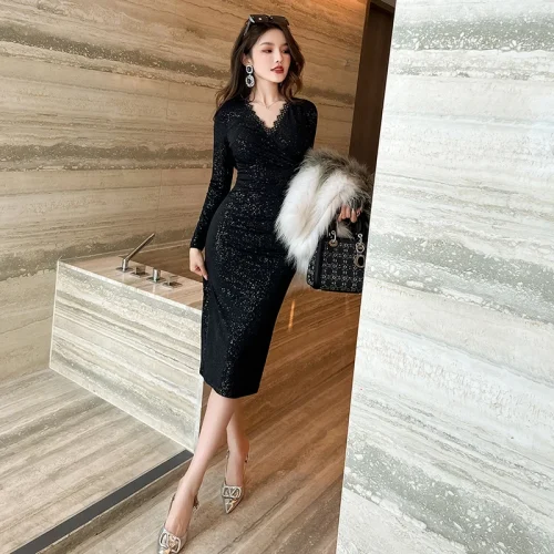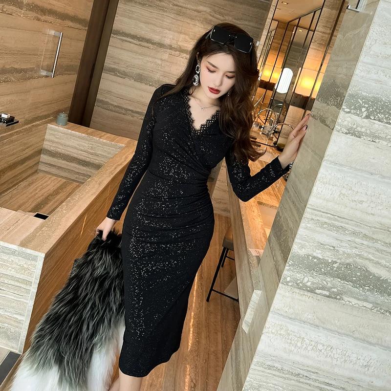 Product Name: ZYHT 20204 2024 Elegant Casual Dresses Sexy Vestidos Prom Long High Quality Black V Neck Lace Dresses Sequined Party Dresses