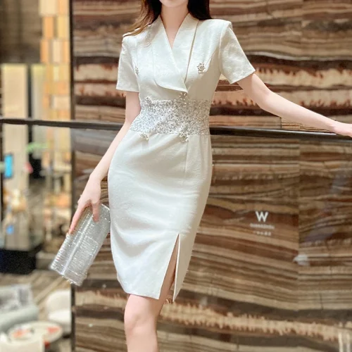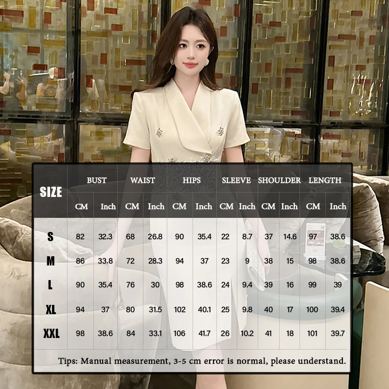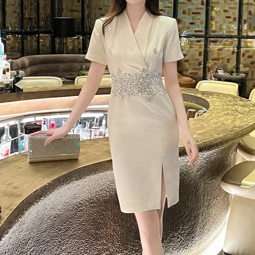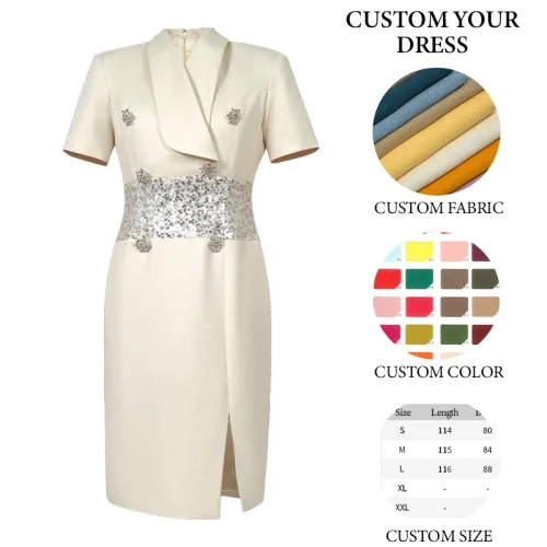 Product Name: ZYHT 51079 Fashion Formal Clothes Short Sleeve Sequined Patchwork Suit Dress Office Lady Professional Business Midi Long Dresses