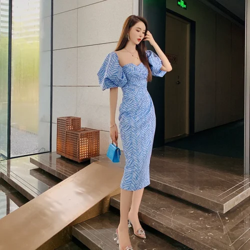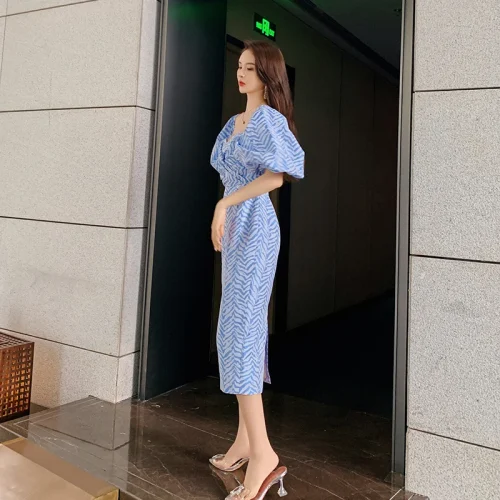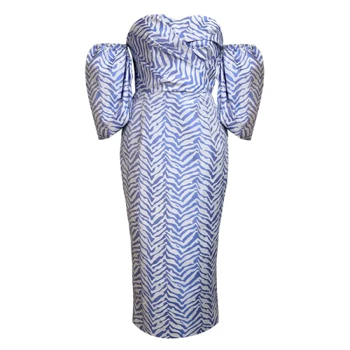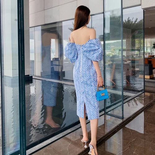 Product Name: ZYHT 5173 Spring Summer 2023 Women Party Strapless Dresses Fashion Jacquard Sexy Off Shoulder Blue Backless Casual A-Line Dress