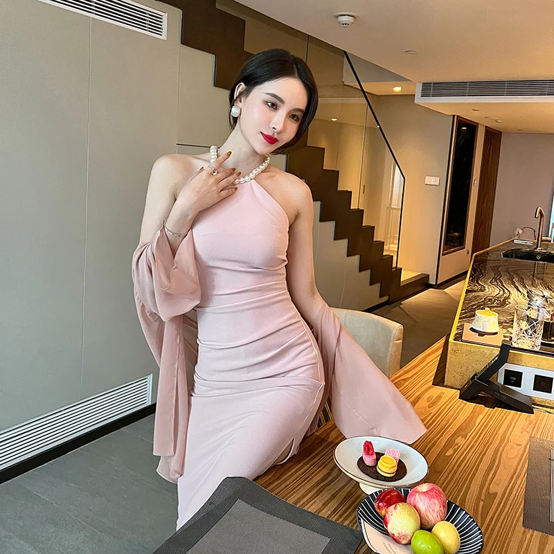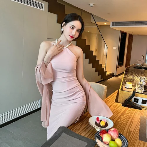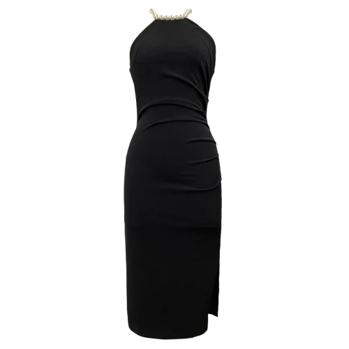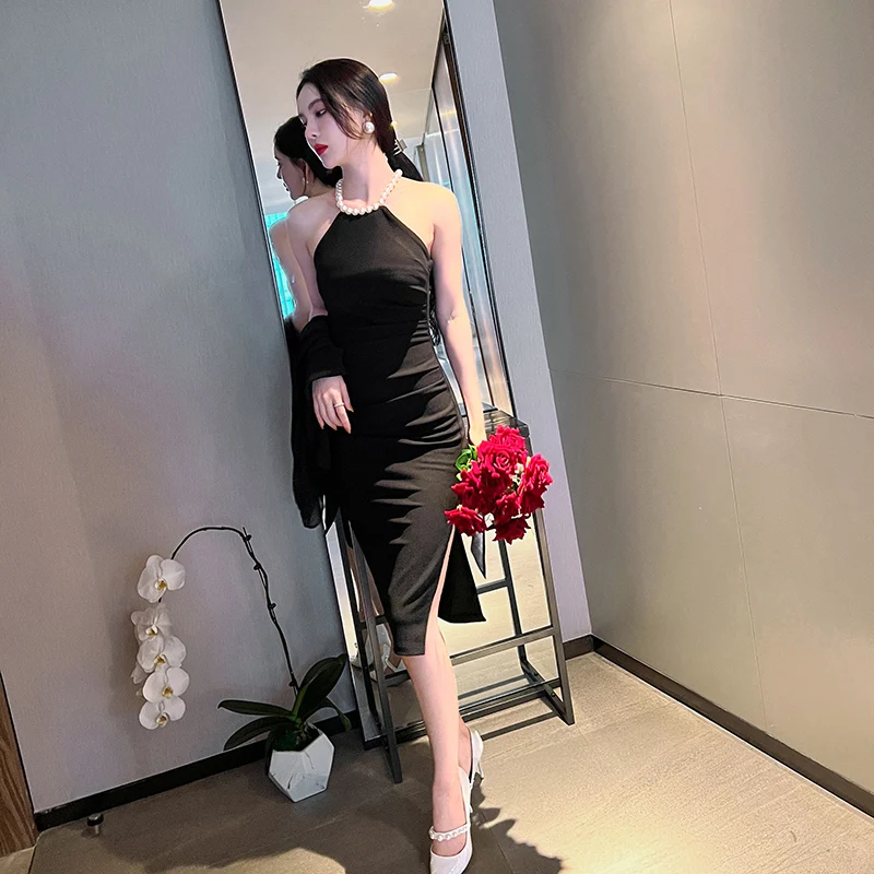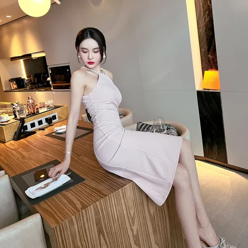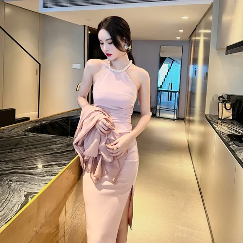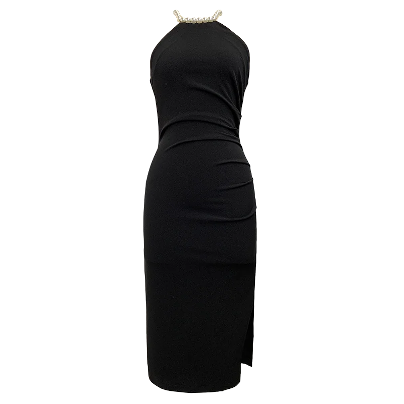 Product Name: ZYHT 5747 Fashion Solid Sleeveless Pleated Slit Slim Casual Package Hip Dress Sexy Beaded Halter Tight Women Dress