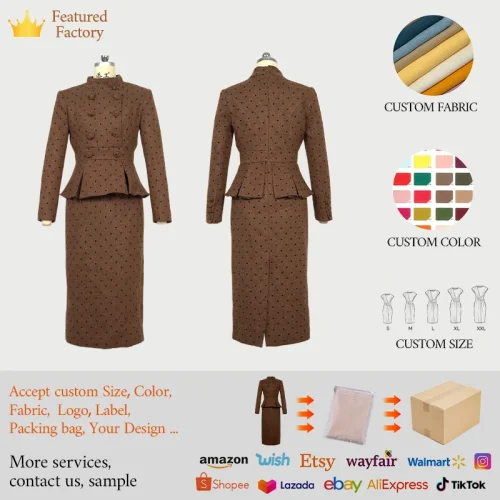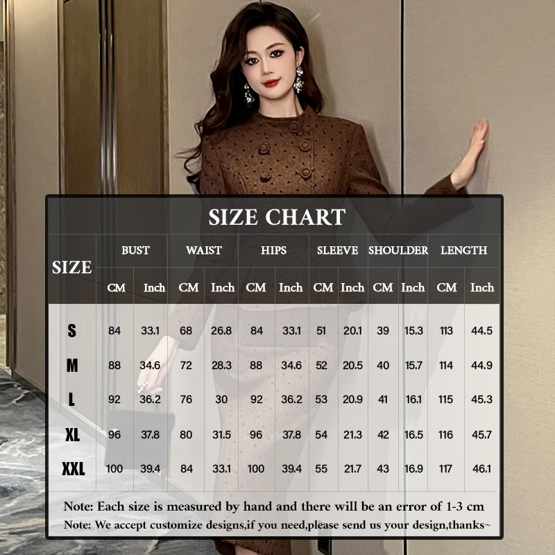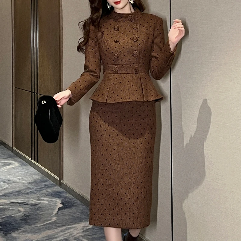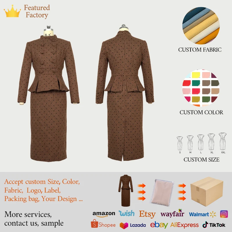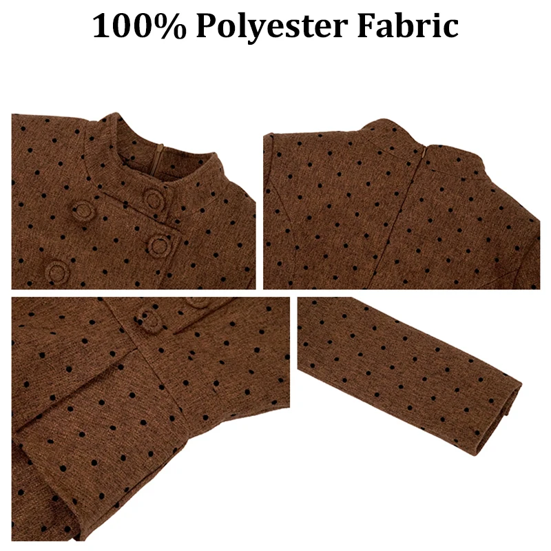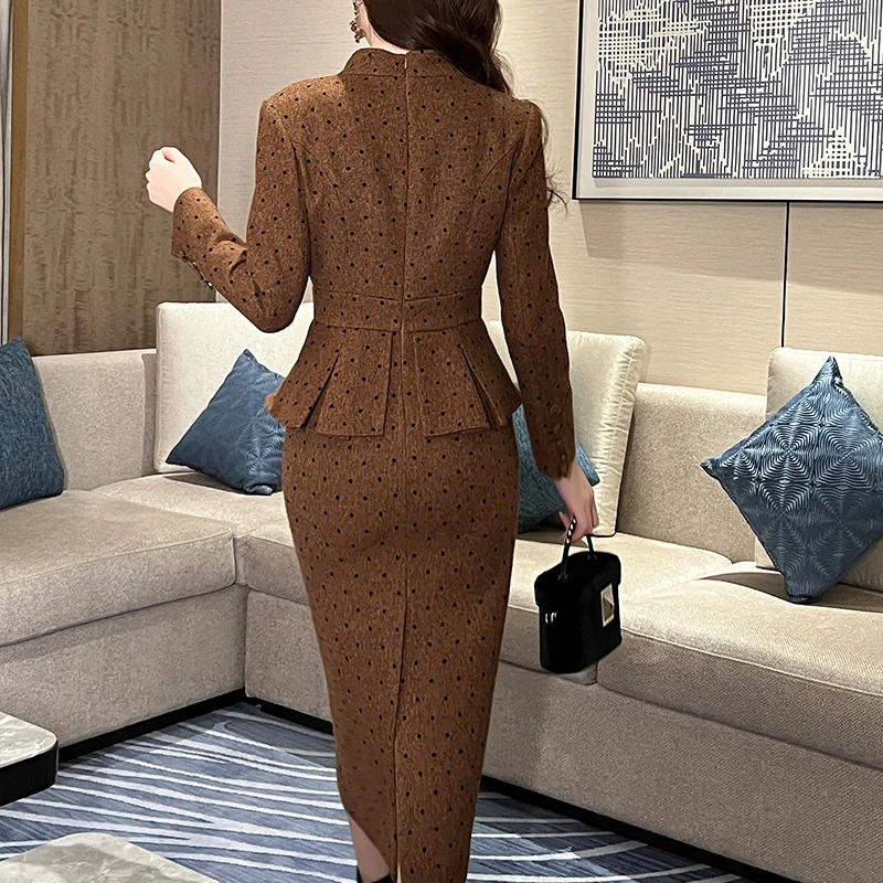 Product Name: ZYHT 61148 Women Formal Office Work Dress Spring Autumn Dresses Brown Woolen Tweed Blazer Ladies Career Pencil Dress