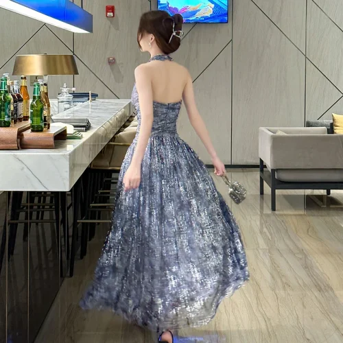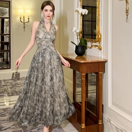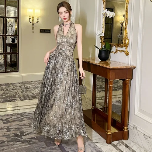 ZYHT 70278 Halter Glitter Fabric Casual Summer Sleeveless Maxi Dresses Sundresses for Women
